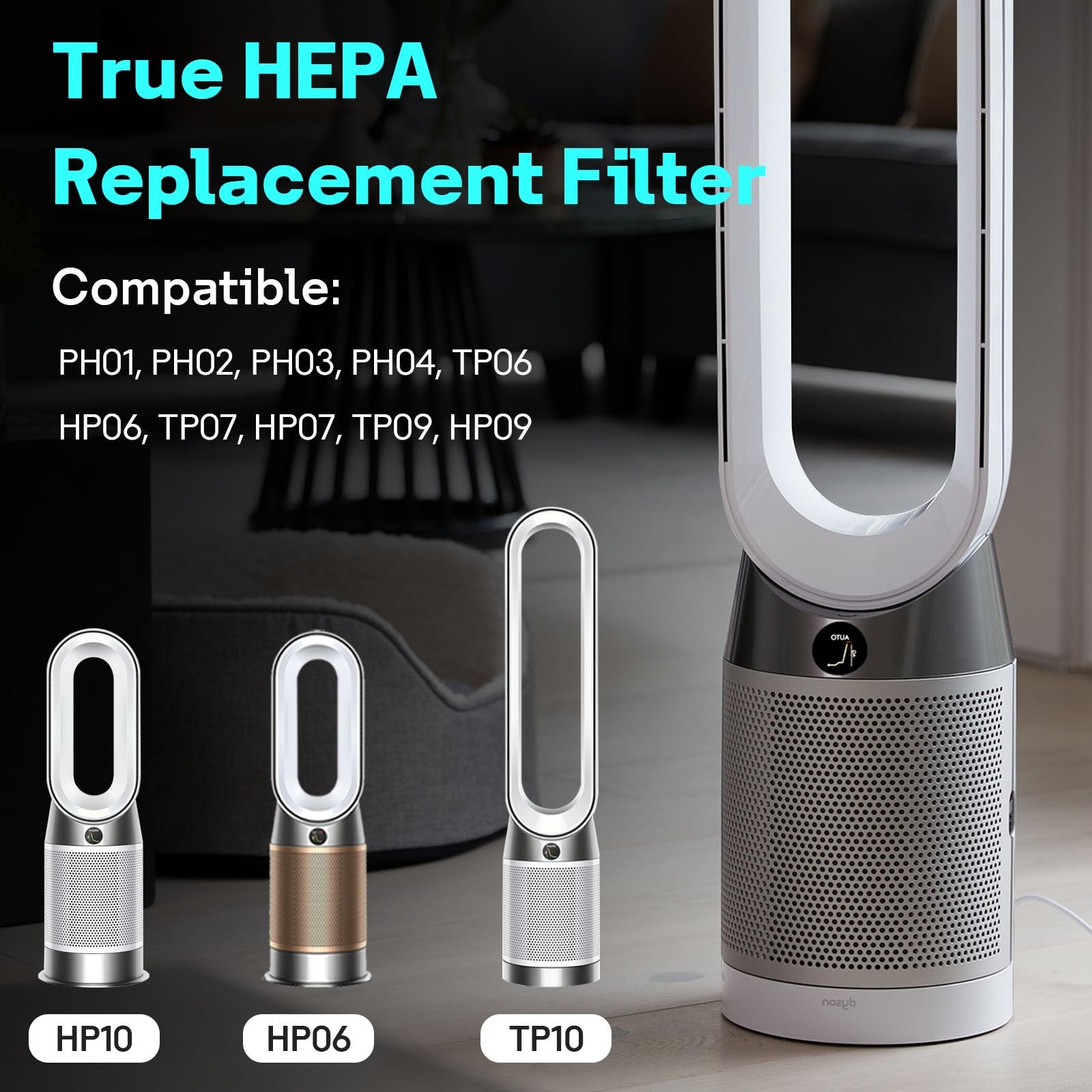 Package Include: 1 × HEPA Filter 1 × Cleaning brush Compatible with: Dyson Pure Humidify+Cool PH01 purifying humidifying fan Dyson Pure Humidify+Cool Cryptomic PH02 purifying humidifying fan Dyson Pure Humidify+Cool PH03 purifying humidifying fan Dyson Pure Humidify+Cool Cryptomic PH04 purifying humidifying fan Dyson Pure Hot+Cool Cryptomic HP06 purifying heater + fan Dyson Pure Cool Cryptomic TP06 Dyson Purifier Hot+Cool HP07 Dyson Purifier Cool TP07 Dyson Purifier Hot+Cool Formaldehyde HP09 Dyson Purifier Cool Formaldehyde TP09 Recommend replacing your filters once per year. Note: Please double confirm whether your machine model is the same as what we advertise before purchasing This is not a Dyson OEM product. The Dyson brand names and logos are the registered trademarks of their respective owners. Any use of the brand name or model designation for this product is made solely for the purpose of demonstrating compatibility. 【PERFECT FIT】: 360° combi glass HEPA & Carbon filter replacement - Compatible with Dyson HP10 HP07 TP10 TP09 TP07 TP06 TP04 TP4A HP04 HP06 HP09 HP4A HP7A PH01 PH02 PH03 PH04 DP04 PH2 HP2 PC2 PC1 HP1 Models for Dyson Pure Cool, Pure Hot Cool Cryptomic and Humidify Cool Air Puri-fiers 【PLEASE NOTICE】: This TP10 filter is NOT compatible with TP03, TP02, TP01, AM11, BP01, HP02, HP01, DP02, DP01. Please double-check your model on the bottom or side of the machine before placing your order 【BRAND NEW 2-IN-1 FILTER】: This 360° combi glass filter for the Pure Cool Hot Humidify fan combines HEPA and carbon filters into a single piece, making installation and maintenance even more convenient. (Replacement Part #970341-01) 【PREMIUM HEPA FILTER】: True HEPA filter attaching 99.97% of particles as small as 0.3 microns, and cleans pet dander, pollen, and dust. The activated carbon filter efficiently absorbs household odors from smoking, pets, and cooking fumes 【SUPERIOR QUALITY】: Our PH04 PH03 PH02 PH01 HP09 TP09 HP07 TP07 HP06 TP06 HEPA filter replacements are made using premium H13 True HEPA materials. The carbon component in our product is made from FSC-certified charcoal powder 【NOTICE】: When installing the filter, disconnect the power first and place the strap facing upward at the top. After replacing the filter, it's essential to reset it, or the machine won't recognize the new one. Please refer to the user instructions for details. Before installing the 2-in-1 filter, if your home was previously equipped with a filter composed of a filter mesh and activated carbon, you'll need to remove both parts before the filter can be installed properly 【OUR DEAR CUSTOMERS】: If you encounter any quality issues, please don't hesitate to contact our 24/7 customer service team. We're here to address and resolve any concerns you may have promptly