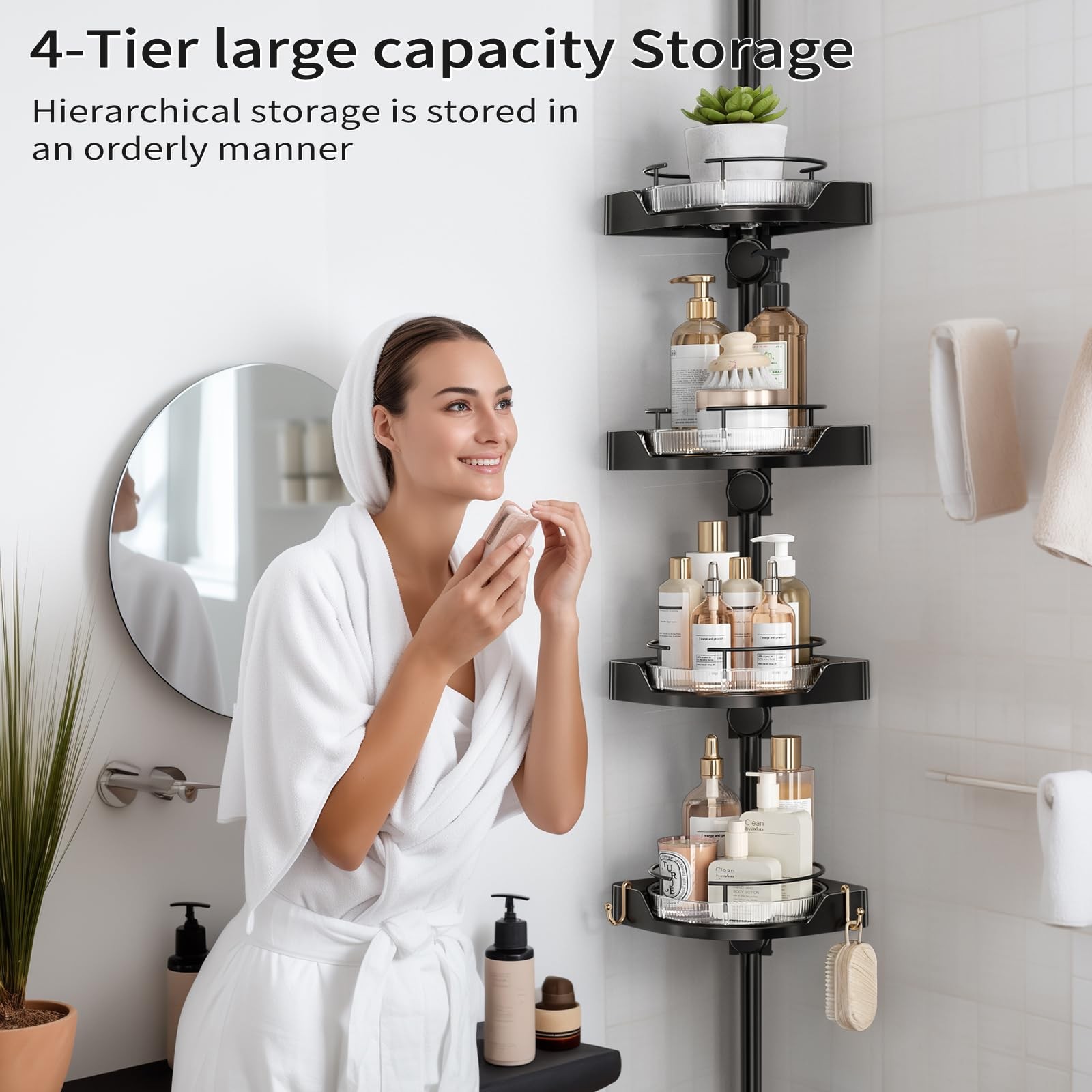 Corner Shower Caddy Tension Pole, 4 Tiers Rotating Shower Organizer for Bathroom Shelf Bathtub, Adjustable Standing Shower Rack Bathroom Accessories, Easily Assemble, 34-124 Inch Height,Black Corner Shower Caddy Tension Pole Design, exquisite bathroom rotating storage tray, easy to retrieve and bathroom supplies, multi-layer bath caddy can fully meet the storage needs of bathroom accessories. The multi-layer corner shower caddy tension pole storage tray is fixed with specialized buckles to prevent slipping, Quick Assembly, Durable Materials.Tension rod shower caddy can be quickly assembled successfully. According to the assembly instructions, most people can complete the assembly of shower caddy corner in a short time. High quality metal materials are used to prevent rust and maintain corner shower caddy tension pole durability, Expanding Bathroom Space, the shower caddy tension pole organizes the space needed for bathroom supplies, expands the bathroom space, and can be conveniently installed next to the bathtub or in the corner of the bathroom wall, saving messy bathroom space, Extended Telescopic Rod, maximum length of 124 inches, the shower organizer corner can meet the needs of most households such as bathrooms, kitchens, or bathtubs that require bathroom storage racks, and can be adjusted appropriately according to changes in height, Detailed Installation Instructions, please confirm the height of the installation position first, and assemble this bathroom shelves according to the steps in the manual,