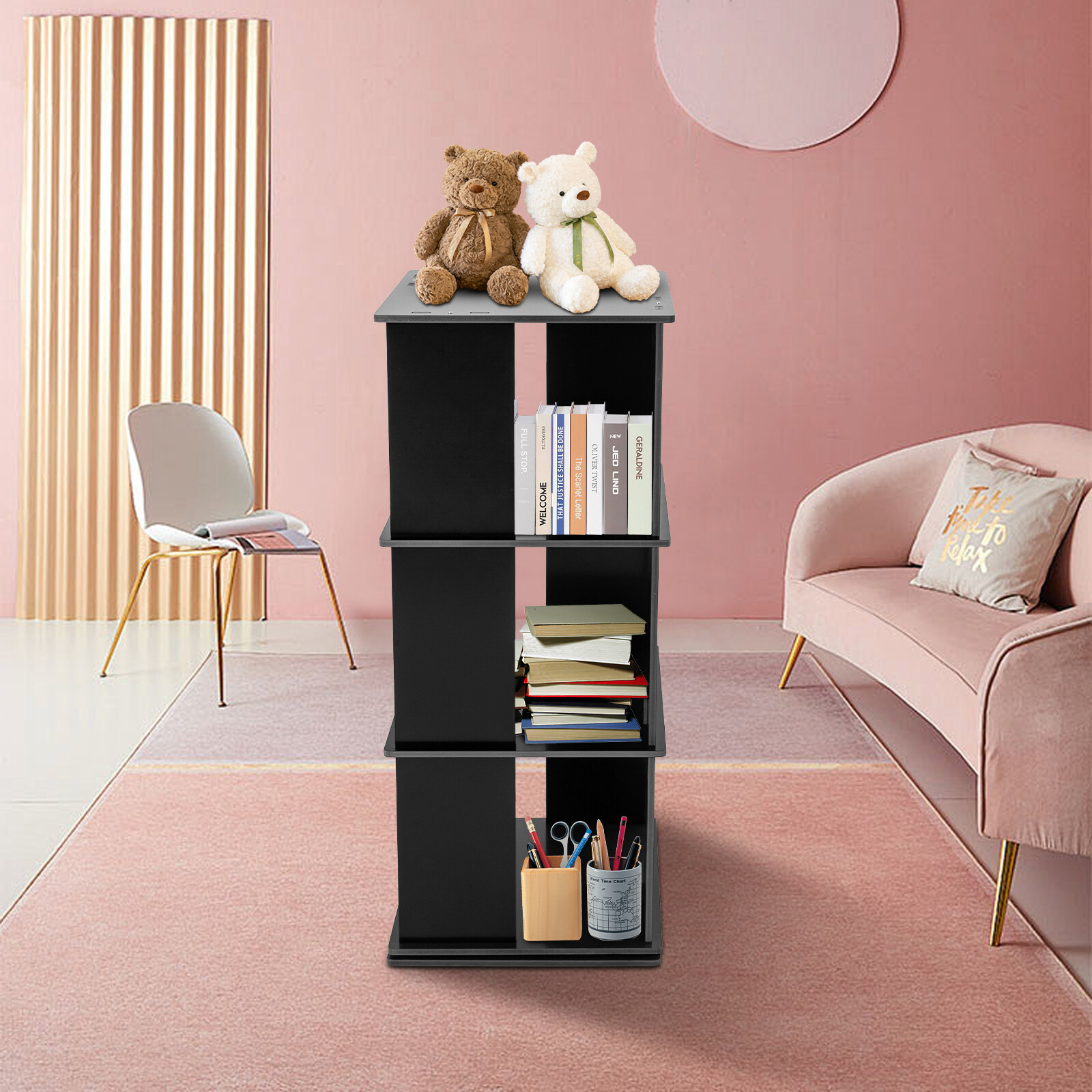 3-Shelf Stackable Revolving Bookcase 360° Rotating Modern Bookshelf Organizer Description Against the ever-increasing pace of contemporary life, finding a quiet corner to immerse oneself in the sea of knowledge has become a luxury many people aspire to in their hearts. It is out of a deep understanding of this spiritual pursuit, a blend of classic aesthetics and modern design concepts of furniture masterpieces - a three-tier rotating bookshelf came into being, it is not only a storage unit but also a home space in the artwork, so that every reading choice, are transformed into a double feast for the eyes and mind. Key Features Robust and Durable: Carved from durable PVC eco-friendly paint-free board, it is formaldehyde-free and odorless , ensuring that the bookshelf is sturdy, stable, and healthy. Rotating Design: Its base can be easily rotated to achieve 360 ° to get books, greatly enhancing the convenience of the reading experience, and can help children develop a good habit of timely storage after reading. Neat Organizer: Adopting a three-tier design, each tier has a capacity space of 15.75*15.75*11.81'', which can accommodate and collect most books and other items in an orderly manner, so you can say goodbye to the clutter. Stable Support: The double-supported non-slip base, screw-reinforced design, mortise-and-tenon construction, and 10mm plate thickness all greatly enhance the stability of the product, with an overall load capacity of 110.23 lbs, allowing you to place your items with confidence. Outstanding Display Effect: In addition to being used as a bookshelf, it can also be used to display artwork, greenery, photo frames, and other decorative items (all not included), making the bookshelf the focal point of the space with both practical and ornamental value. Humanized Height: The total height of the bookshelf is 38.19 inches, which is suitable and takes ergonomics into account to ensure that you don't need to bend over or stand on tiptoe when putting books away, bringing you a comfortable experience of using the bookshelf. Thanks to its compact shape, you can place it in the corner, next to the sofa or table. Simple-up Clean: The smooth surface, simple structure, and open design make the daily cleaning of the bookshelf easy and simple, just wipe it gently to keep it clean and as good as new. Stylish Simplicity: The minimalist aesthetic creates smooth lines and elegant colors that blend harmoniously with modern, industrial, or vintage-style interiors to enhance the style of the space. Installation Fun: Thanks to complete installation accessories, clear installation instructions, mortise, and tenon installation structure, allowing you to complete the assembly in a very short time, enjoy the fun of installation. Customer Service: We aim to provide quality products and services. If you have any problems, please feel free to contact us. We will reply and solve the problem for you as soon as possible. Details Matching Gloves: They can protect your hands from injury during installation. Book Stop: Each tier is equipped with stoppers to prevent books from falling for added safety. Top Platform: It provides you with extra space for photo frames, small potted plants, etc. while enhancing the style. Smooth Edges: The smooth, burr-free edges not only improve aesthetics, but also enhance safety during installation and cleaning. We also provide extra sandpaper to make it easy for you to sand the edges. Application It can hold various kinds of books, magazines, decorations, photo frames, green plants ( all excluded), and so on. It is suitable for placing in the living room, balcony, children's room, study room, living room, school, church, library, shopping mall and other places. Specification Material: PVC Paint-free Board Process: Carving Color: Wood Color/White/Black Shape: Rectangular Style: Modern Assembly Required: Yes Rotation Angle: 360° Board Thickness: 10mm/0.39in Mounting Method: Mortise and Tenon Structure Mount Type: Free Standing Overall Load Capacity: 50kg/110.23lbs Number of Tiers: 3 Each Tier Size: 40*40*30cm/15.75*15.75*11.81in Product Size: 40*40*97cm/15.75*15.75*38.19in Package Size: 48*46*14cm/18.9*18.11*5.51in Net Weight: 6kg/13.23 lbs Gross Weight: 6.5kg/14.33 lbs Package Included 1* Three-tier Rotating Bookshelf 1 Pair* Gloves 1* Sandpaper 1* English Installation Instruction All Accessories for Use Notes Please check the size before purchasing. Please allow the slight color difference caused by the shooting light and 1-3cm error due to manual measurement and make sure you do not mind before ordering. Payment Delivery details Terms of sales About us Contact us Payment We accept ebay payment 。 Fees such as import duties, taxes are not included in the item price or shipping costs. These charges are the buyer's responsibility. Delivery details Shipping: 2-9 working days to: USA Terms of sales We maintain high standards of excellence and strive for hundred percent customer satisfaction. Feedback is very important to us. We hope that you contact us immediately before you give neutral or negative feedback, so that we can address your concerns. It is impossible to address issues if we do not know about them! About us Your satis faction is our ultimate goal. We work hard to earn your trust and future business. Our certified technicians have tested each item before shipping. The unit comes with 1 year limited warranty on all manufacturing defects. a) If you receive a defective item, you may return it or ask for a discount. Please contact us within 14 days after you receive the package. b) What you returned must be intact and in its original packaging as re? u. Customer is responsible for shipping costs of the returned item. c) We will cover the cost of shipping back t with the shipping rate indicated in the registration page. We will send you a new unit or refund the full payment you paid. Thank you. Contact us Business Hour Business Hour: Monday To Friday: 8:30 AM to 5:00