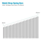 360pcs Heavy Duty Watch PINS SPRING BARS Replacement Band Strap Link 8-25mm Repair Kit Stainless Steel Features: High-Quality Materials : Made of 316L stainless steel for strength and durability, keep your watch safe. S pring bars, watch hands are made of stainless steel, durable, can repair watches for a long time, and are widely used in various watch band replacement, watch bracelet repair and other watch repair items. Compatibility : Designed to fit any watch that uses standard 18mm, 19mm, 20mm, 21mm, 22mm , 23mm, 24mm, 25mm, 26mm spring bars. The size you need is the same as the lug width of your watch band (or buckle width if the spring bar is to be used for a buckle). Double Flange Spring Ba r : Double shoulder design allowing you to quickly and easily insert and remove for repair or adjustment. Great for watch band replacement, watch repair, jewelry making; The special design of the repair tool can easily fit for the watch band, convenient to repair. Huge Amount : Approx. 360pcs spring bars. Packed in a transparent plastic box, easy to store and find the required size. Notes : Please allow slight dimension difference due to different manual measurement.
