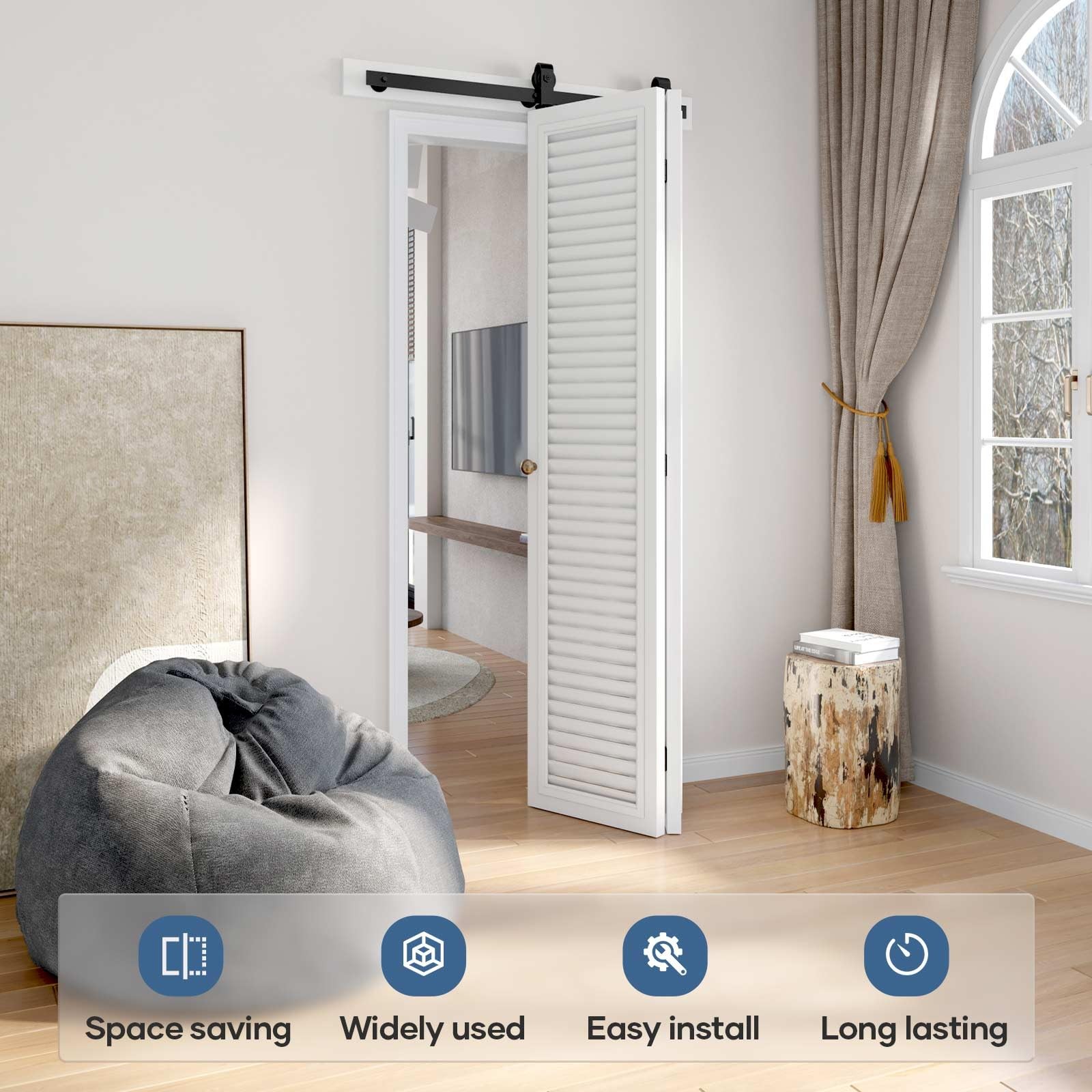 heavy-duty bifold door hardware system revolutionizes space efficiency with its innovative folding mechanism. Crafted from industrial-grade solid steel with a corrosion-resistant black powder coating, this hardware withstands daily use while maintaining its sleek appearance for years. The precision ball bearing rollers have been rigorously tested over 100,000 cycles, ensuring buttery-smooth, whisper-quiet operation that outperforms standard sliding door systems. Space-Saving: The door panel folding design takes up minimal space when opened,making it ideal for small homes,narrow hallways,or compact areas to maximize room efficiency.Can be partially or fully opened,allowing customizable ventilation and natural light control.More flexible than traditional sliding or swing doors,perfect for balconies,wardrobes,kitchen partitions,and more Smooth Gliding Like Butter: Crafted from steel with a fine black powder-coated finish,our bifold barn door hardware resists corrosion for lasting durability.Features high-precision bearing rollers tested over 100,000 cycles for buttery-smooth,silent operation-rigorously inspected for reliability Reminds: Fits up to double 16" wide bifold doors (1"~1-3/4" thickness; 180lb weight capacity). Track length = door opening + 4" (100mm). Requires 5-3/8" ceiling clearance Complete Hardware Kit: Includes 1x36" Rail,2x Rollers,2x Roller Rotating Base,1x Roller Fixator,3x Rail Support,3x Hinge,1x Floor Guide,1x Sealing Strip. DOOR NOT INCLUDED! Backed by 's 24/7 assistance,let us know for missing/defective parts,we will prompt solutions Hassle-Free Installation: Includes a step-by-step installation manual with detailed diagrams and text instructions.Get soft copy and professional installation guide from our online service