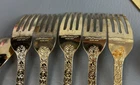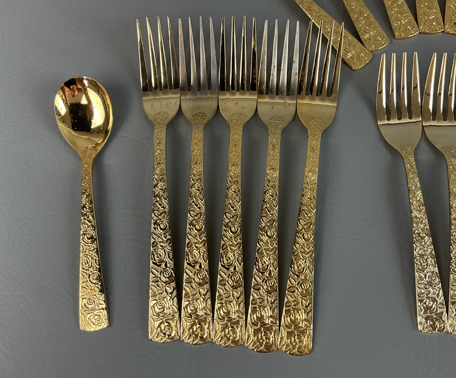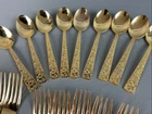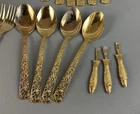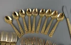 The 36 pieces CELLINI ROMANESQUE Golden Flatware Set with rose handles is a vintage Romanesque style flatware set made by Golden Japan in 1968. The set includes knives, forks, and spoons with a gold color and floral handle pattern. Crafted from stainless steel with a glossy finish, this set is perfect for adults who appreciate classic and elegant dining utensils. The set is a timeless addition to any kitchen or dining room, adding a touch of sophistication and style to meals.