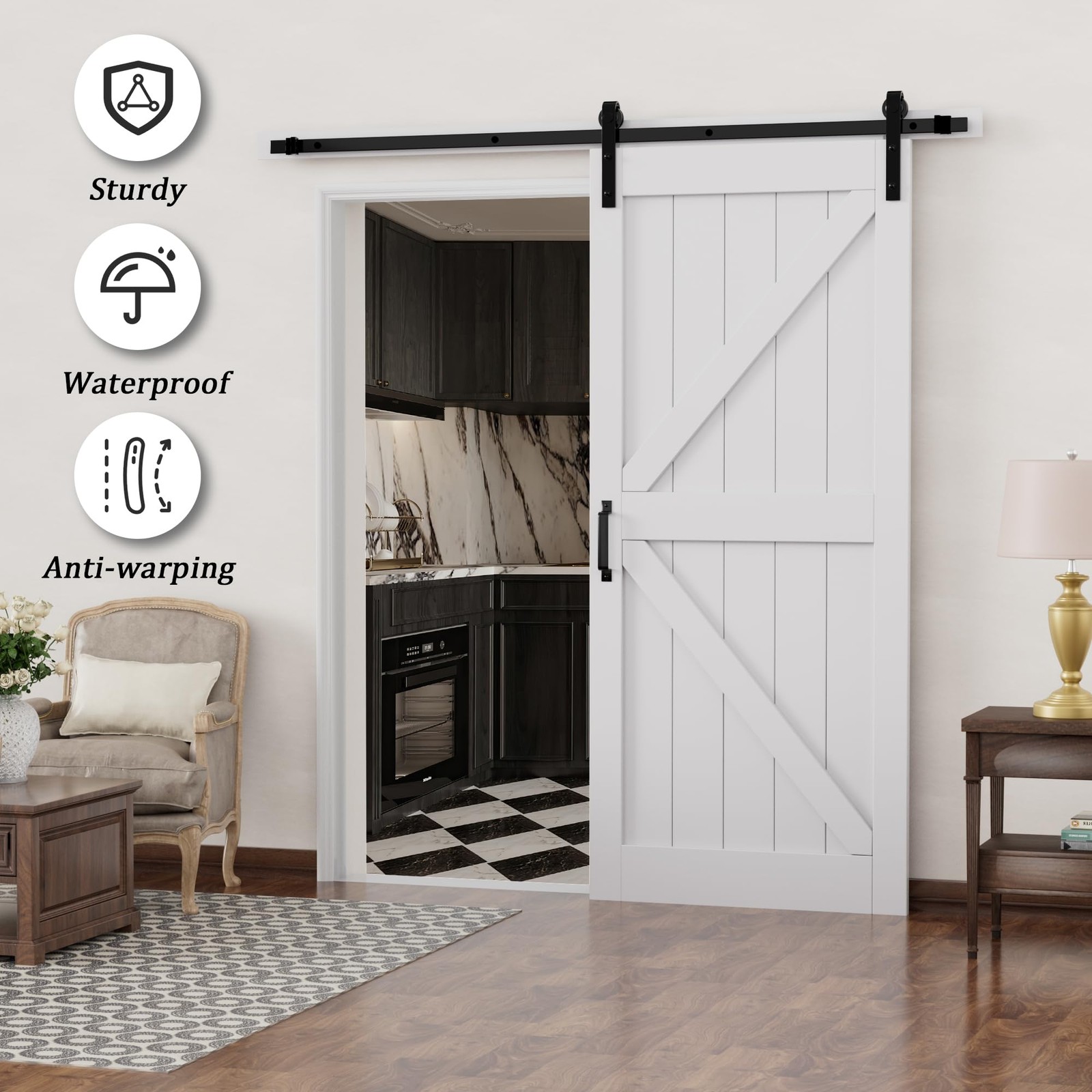 Sliding Barn Door with Hardware Track Kit, DIY Assembly, K-Frame, White Widely Use: The barn door is a perfect match with your interior room, storage room. Whether you're renovating your home or building from scratch, the White Barn Door with Hardware Kit is the perfect choice for adding a touch of sophistication and durability to any room. NO Need for a Craftsman: The package include Barn Door Slab, Sliding Hardware Kit, Handle, Floor Guide, and Installation Tools, Detailed Instruction. We also provide professional online installation guide, if you encounter any problems when you receive or use the product, please feel free to contact. (THE DOOR IS NEED TO ASSEMBLE) Easy Install: We provide step-by-step graphic & text installation parsing manual, you can also get professional installation guide from our online service. 【Water-Resistant & Scratch Resistant】 Pre-finished white paint water-resistant barn door surface is considered for durability, longevity, and ease of cleaning. High-quality solid sliding barn door surface with a flat and thin MDF can also strengthen the protection of the barn door surface, especially for families with pets. 【Easy to Install】 All wood panels are mitered for a snug fit, it is easy to assembly. Barn door is pre-drilled. A simple assembly is required, just install the rail on the wall and hang on the door, then you could have a perfect sliding barn door. 【Ideal for Various Scenarios】 Perfect for a kitchen, bedrooms, storeroom, dining room area or an elegant transition between spaces, barn doors enhance and unify your space with light and beauty, durability and beauty for long years of enjoyment. 【Package List】1x Barn Door, 1x Track Kit, 1x Handle, 1x Latch Lock, 1x Floor Guide, and Installation Manual. (Each door comes with separated planks and easy to put together) 【Guaranteed Service 24/7 Stand By】 Packaging comes with detailed barn doors and hardware included installation manual, which can be intuitively installed by yourselves. If there's any problem, please let us know, our professional Customer Service Team will actively answer them for you.