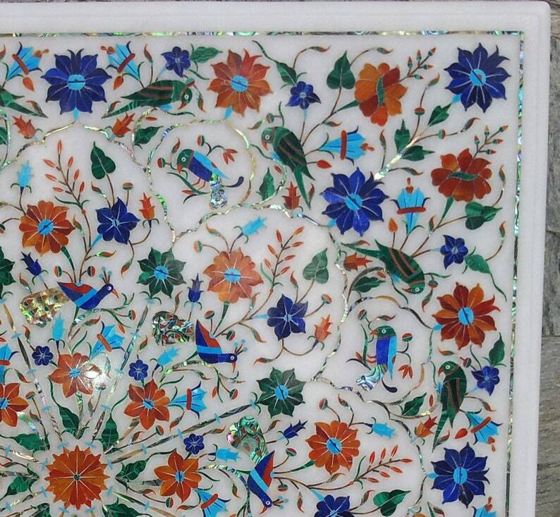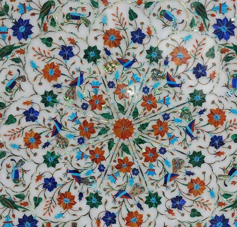 What is Inlay Art? One of the most attractive work of art that comes from marble is"Marble Inlay" work. It is the same work that adorns the Taj Mahal and other Mughal monuments. It is a closely protected traditional art and only a few expert exponents are available today. The delicate process involves cutting and engraving marble shapes manually. To start with, a predefined pattern e.g., floral design or geometrical design is engraved on the marble slab. Small pieces of marble of different shades are cut delicately to fit in these grooves precisely. These small pieces are then slipped in the grooves. Apart from marble, many other materials can also be used. History Of Inlay Art Inlay work on delicate precious stone began in the workshops of Florence in Italy around the end of the 16th century. This was known as PIETRA DURA.(Pietra= Stone, Dura= Hard) The Italians had created a classic artistic form and held a monopoly over it. From 1630 onward pietra dura appeared on movable, small objects as decorative panels, with bird and flower motifs, suitable for cabinet fronts and table tops. Some of these soon reached the Mughals in the form of presents. Of all the Mughal Emperors, Shah Jahan was the greatest patron of architecture in India. For him no amount of money or time was too much to create enduring, everlasting architectural beauty and through it be remembered always. It is in his buildings that one feels most compelled to make the connection between Mughal art and pietra dura. The Taj Mahal, the cenotaphs of the Emperor and his wife, the main floor and the surrounding marble railings bear very close resemblances to the pietra dura form. Process of Marble Inlay Art Master Craftsman carefully plans a design, which is etched lightly into the marble surface and later scored out with an iron chisel. Many of the tools of the trade are basically the same as those used by the Mughals hundreds of years ago. He then decides on the colour scheme depending on the requirements of piece being created. Semi-precious stones and gems are expertly chosen to give just the right graduation in colour and shade for the overall radiance of the pattern. They are shaped and polished by means of an emery wheel. Sometimes heat treatment is applied to certain stones to get a shading effect. The effort involved in making just one single flower can often take days of work, depending on the detail; it is not unusual to be designed from hundreds of different slices of stone. There are many varieties of coloured stone available for utilisation in marble inlay work: malachite, cornelian, jasper, mother of pearl, abalone shell, lapis lazuli, agnate, coral, turquoise and tiger eye to name just a few. The grooves are filled with their precisely corresponding shapes of coloured stone and secured in place with a white putty made from oil, and wax. Once the design is completely dry, the piece is polished with a mixture of sand, water and emery paper to give a shiny smooth finish. Note:- Customs Duty and other duties levies in destinations country are responsibility of the buyer