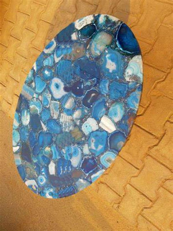 Welcome To Stone-Craft- Creations Shop Description Very unique Art by Indian Artist ,Coffee/Side Table top Used Material: Natural Agate Stones Arts Size: 24"x36" Inches Color: As Photo Shape: Oval Pattern: Handmade Room: Bedroom, Dining Room, Hallway, Home Office/Study, Kid’s Bedroom, Kitchen, Laundry/Utility Room, Living Room,Patio, Playroom Packaging: Wood & Foam Export Packing Shipping: Air Can Be customize ,Please Message us your desired Size 1. It can be used as a Dining Table, Guest table, coffee table, center table top in show room as well as a gift for your loved ones. 2. The table top is made in Agra India & fully handmade. 3. The top will be delivered by FedEx or DHL free of cost door to door. 4. If there is any local tax,custom duties or Vat will be paid by the buyer at the destination. 5. The parcel is dispatch with proper packing & fully insured covering all kind of risk. 6. To maintain the table top is simple soap & water & dry cotton cloth. 7. If You Are Looking Something Customize, Let Us Know We Will Make For You As Per Your Design, Size & Shape. 8.Table top does not includes any wooden, marble stand or base if you like to buy marble or wooden base or stand that will be charged extra. Marble Agate Table Tops We are Manufacturer & Exporter of marble agate table tops. These marble agate table tops have different shapes like Round Table top, Octagonal Table Tops, Rectangle / Dining table tops, Square Table tops, Chess Table tops, Taj Mahal Table tops, Custom Designs Table tops also make marble Table top Base and Stand. Then we can be used as dining tables, coffee tables, Center tables, conference tables, chess boards, reading tables, bar tables , Garden table, side and corner tables or any other use as per the indoor and outdoor decor. They can also be placed outdoors in the garden, as marble is stain free, offers great resistance to the forces of nature, and can withstand heavy temperatures. We also meet customized requirement and offer our marble table tops at industry leading prices. About Agate Stone- Agate is a rock consisting primarily of cryptocrystalline silica, chiefly chalcedony, alternating with microgranular quartz. It is characterized by its fineness of grain and variety of color. Although agates may be found in various kinds of host rock, they are classically associated with volcanic rocks and can be common in certain metamorphic rocks. Ancient use of agate stone Agate is one of the most common materials used in the art of hardstone carving, and has been recovered at a number of ancient sites, indicating its widespread use in the ancient world; for example, archaeological recovery at the Knossos site on Crete illustrates its role in Bronze Age Minoan culture Types Of Agate 1. Fortification Agate This is the most common and distinctive type of agate. In these agates, bands crystallized into concentric layers that more or less follow the shape of the cavity. The banding resembles an aerial view of a fort 2. Water-Line Agate (also called water-level or onyx) During its formation, silica-rich solution either entered the cavity slowly laying one band at a time, excess water drained out leaving a small amount of silica to settle out into separate bands, or the vesicle filled under low pressure. In any case, the silica crystallization in water-level agates is controlled by gravity in one orientation, forming a stack up of parallel bands. 3. Shadow Agate Some agates exhibit a shadow effect in which there is what appears to be movement across the agate layers when the specimen is rocked back and forth (or your orientation to the specimen moves). This optical effect only occurs when there are alternating translucent and opaque bands. It is caused when light goes into the agate, but is not reflected out. 4. Tube Agate Tube Agate During the formation of some agates, parallel projections of tiny hair-thin mineral rods grow first within the silica gel, around which later the chalcedony agate micro-crystals form. In some cases the inclusions remain, but sometimes they weather away leaving hollow tubes that subsequently fill in with silica. 5. Eye Agates This mysterious agate characteristic is believed to be formed when most of the silica gel drains from the cavity, leaving only a droplet that “beads up” on the inside wall of the cavity. This droplet crystallizes into solid chalcedony “eyes”. In some cases, crystal growth will continue from this droplet in a manner similar to the formation of stalactites in caves. Later, the pocket fills in with the usual deposition of chalcedony microcrystals. 6. Plume Agate These agates initially had formations on their outside layer that formed prior to the deposition of chalcedony bands. They are filament growths of mineral inclusions that resemble ferns or feathers. 7. Geode Agate Geode Agate In some cases the supply of silica-rich water runs out before the entire cavity fills in. When there is a hollow center within a crystalline outer fill, the specimen is considered a geode. Not all geodes have agate banding, but many do. Also, the inner layers can form into several different types of silica mineral crystals and may even have other types of mineral crystals. 8. Moss Agate Moss Agate Moss agates have clusters of mineral inclusions that resemble plants, trees, or landscapes. Most moss agate inclusions are comprised of iron or manganese oxide. In some cases, the inclusions inhibit chalcedony banding allowing the mineral clusters free reign to grow within the silica gel. 9. Seam Agate Seam agates for in cracks within host rock, rather than in rounder pockets. The bands form in parallel rows that follow and fill in the crack or seam.