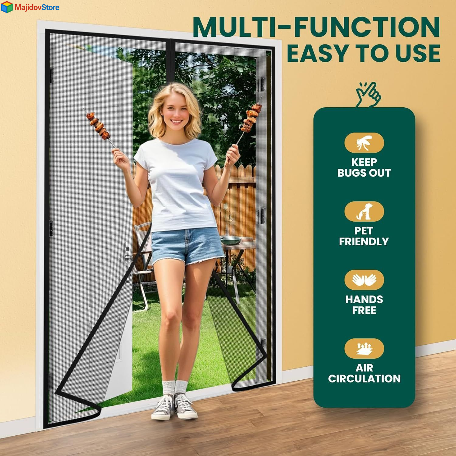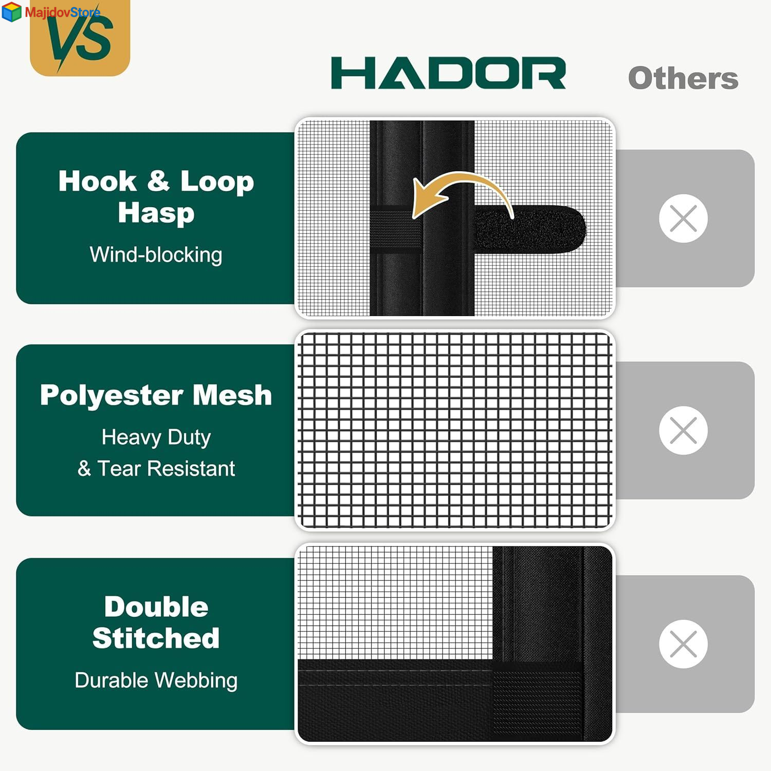 Magnetic Screen Door Mesh with Super Fit Size 36x80 Inch, Middle Opening Description Features: How to Select the Right Size: Measure twice, buy once. Our screen, screen sized 38 x 81 inches, fits a 36 x 80 inch door. The screen should be 1 inch longer and 2 inches wider than your door for proper mounting on the outer frame. Please measure your door carefully and make sure to order a size that will cover your door properly. Special Windproof Hasp: HADOR screen door mesh has hook and loop hasps at the middle and bottom. These hasps work to firmly secure the door mesh, preventing it from being easily blown away by strong winds. Hands-free and Pet Friendly: Our magnetic door has strong magnet blocks in the middle seam. It opens easily and closes automatically, even when your hands are full. Your pets can go through freely as they please, and door screen closes automatically. Upgraded and Sturdy Screen Door: The door net is heavy duty polyester material with 18 x 16 mesh. It's high density, hard to break, and has good light transmittance. Lets in fresh air and sunshine, great for kids and creatures to move through freely. Easy Installation: The magnet screen door comes with all the necessary push pins and a strong hook and loop tape, enabling quick and hassle - free installation. To achieve the best adhesive effect, make sure to clean and dry the installation surface thoroughly before starting the installation process. Versatile Usage: HADOR screen mesh door fits a wide range of standard sized doors, like patio, French, sliding glass, entry, back, front, interior, exterior, balcony, entrance, double, kitchen, and retractable doors. It's great for indoor and outdoor use. Product Details: Brand: HADOR Color: Middle Opening Material: Reinforced Polyester Style: Middle Opening Item Weight: 1.54 Pounds Assembly Required: Yes Manufacturer: HADOR Part Number: Mesh Size 38" X 81" Item Weight: 1.54 pounds Product Dimensions: 0.01 x 38 x 81 inches Item model number: Fit Door Size 36" X 80" Size: Fit Door Size 36x80 Inch Item Package Quantity: 1 Included Components: 1 Roll of Hook&loop Tape, 1 Box of Push Pins Batteries Included?: No Batteries Required?: No Brand: HADOR Color: Middle Opening Material: Reinforced Polyester Style: Middle Opening Item Weight: 1.54 Pounds Handling We will ship all orders within 2 business day of payment. Delivery We Do Not Ship Outside of the Continental US. Return Policy All items qualify for returns within 30 days of receipt. Buyer is responsible for return shipping on any item that is not damaged. Feedback We take our reputation seriously, we buy and sell online, so we understand the value of trust. If you are unsatisfied with your order, please contact us and we will work with you to resolve it to your satisfaction.
