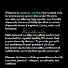 Free eBay listing template designed by dewiso.com Sunshine Jewelry Product Welcome to sunshine_jewelry, your ultimate destination for stunning natural & lab-grown diamonds and high-quality jewelry! Our online store is dedicated to offering you elegant, ethical, and affordable pieces that will last a lifetime. Whether you're searching for the perfect engagement ring, a timeless bracelet, or a unique custom piece, we have something special for every occasion . Shipping At sunshine_jewelry, we offer fast and reliable shipping through trusted carriers like UPS, DHL, and FedEx, with guaranteed delivery in 5-7 days. Each order comes with a tracking number, so you can monitor your package. We ensure secure packaging to protect your jewelry, and offer international shipping to selected countries . Contact If you have any questions or need assistance, feel free to reach out to us! You can contact us directly through eBay messages for a quick response, or send us an email. We are here to help with any inquiries regarding your order, shipping, or product details. Customer satisfaction is our top priority at sunshine_jewelry! . At sunshine_jewelry, we are a proud manufacturer of high-quality lab-grown diamonds and diamond jewelry. Each piece is crafted with precision and care, from engagement rings to custom designs, ensuring timeless beauty and exceptional craftsmanship. Our diamonds are ethically sourced, lab-grown, and eco-friendly, offering the brilliance of natural diamonds while supporting sustainability. Every stone is thoroughly checked for clarity, cut, and color, and comes with a certificate of authenticity, ensuring premium quality. Beyond delivering beautiful products, we are dedicated to providing an outstanding customer experience. From custom orders to fast shipping, we ensure every customer is satisfied and delighted with their purchase. Features and further details At sunshine_jewelry, we specialize in premium lab-grown diamonds and expertly crafted diamond jewelry. Our collection features a wide range of designs, from elegant engagement rings to personalized custom pieces, each created with the highest attention to detail and quality. Additional Features: Our diamonds are ethically sourced and eco-friendly, providing the same brilliance and durability as natural diamonds. Each stone is carefully inspected for its cut, clarity, and color, ensuring that you receive a top-quality gem. All pieces come with a certificate of authenticity for added confidence. Details: Our jewelry is made using the finest materials, including durable metals like 14K and 18K gold and platinum, ensuring long-lasting wear. Whether you are looking for a minimalist design or something intricate, we offer a variety of styles that suit every occasion. Package Includes: Each piece of jewelry is beautifully packaged in a premium box , perfect for gifting or safe storage. Your package also includes the certificate of authenticity and care instructions to help keep your jewelry looking its best for years to come. All Right Reserved @ Sunshine_jewelry