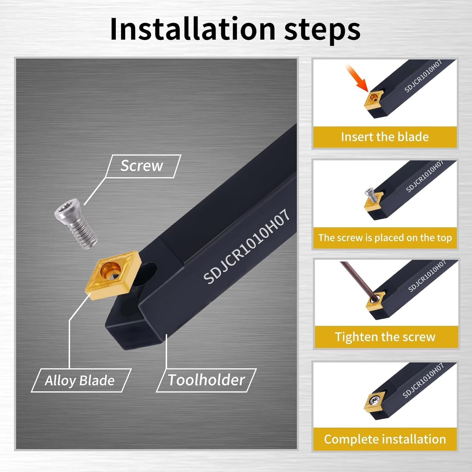 3/8" 10mm Indexable Lathe Turning Tool 21Pcs Kit- 7Pcs Metal Lathe Tools Holder Set with 14Pcs Carbide Insert Turning Inserts for Turning Grooving Boring Threading Cutting.Carbide Lathe Tools All-in-One Kit:Our Indexable Lathe Turning Tool Set have 7Pcs different angled tool holders:SCLCR1010H06,SNR0010K11,SDJCR1010H07,SDNCN1010H07,MGEHR1010-2,SER1010H11,S10K-SCLCR06.You can easily choose the right tool for any project. Package include:7pcs 3/8" 10mm metal lathe tools holders, 14pcs carbide inserts and 8pcs matched wrenches.Whether you are a professional or a DIY enthusiast, our products are your reliable assistants. Excellent materials:The turning holders is made of high-quality 40Cr steel and is coated with anti-rust oil. It has excellent hardness and speed, and is durable, eliminating the trouble of frequent tool replacement. Versatile Inserts:Our carbide inserts are CVD coated. Strong and sharp, with excellent cutting performance and chip removal effect. Suitable for stainless steel, steel, cast iron, etc. The turning tool holders adopts a detachable inserts design, making inserts replacement more convenient and faster.We provide 24h support, 3months refund, 360days warranty. Don't hesitate–get yours now!