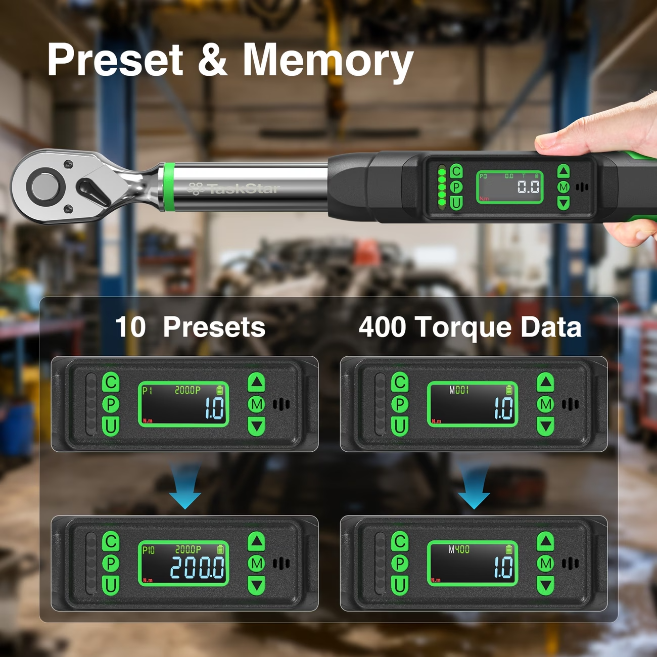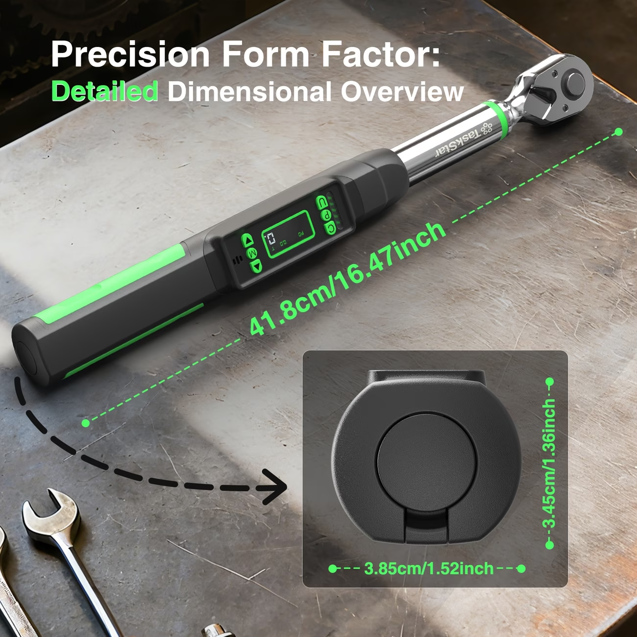 The 3/8 Electronic Torque Wrench by TaskStar is a high-quality hand tool designed for precision and efficiency. With a ratcheting action and adjustable features, this wrench is perfect for various home and workshop projects. Constructed from durable alloy steel, this electronic torque wrench comes with attachments and has a 3/8 inch diameter, making it versatile for a range of applications. The sleek black color and compact design of 41.8cm in length make it easy to handle and store for daily use.