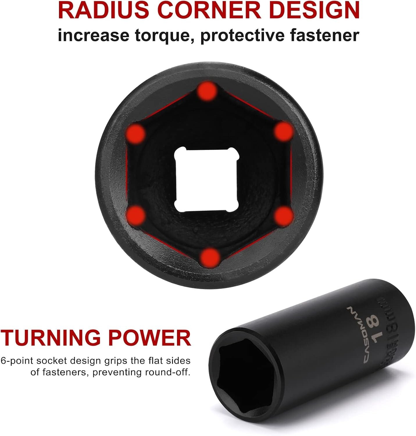 【Detail size】: The 50pcs 3/8" socket set includes 28PCS Deep/Shallow metric socket: 8, 9, 10, 11, 12, 13, 14, 15, 16, 17, 18, 19, 20, 21, 22mm; 16PCS SAE socket: 5/16", 3/8’, 7/16", 1/2", 9/16", 5/8", 11/16", 3/4"; 2PCS extension bar: 3", 6”; 3/8" ratchet handle, 3/8” impact universal joint, 1/2” to 3/8” socket adapter, 3/8" impact grade socket adapter and hex to 1/4" square drill socket adapter. 【Material processing】: 50pcs SAE/metric socket set all sockets are made of Chrome Vanadium steel (CR-V), with black phosphoric acid coating on each socket surface, keeps longer life and corrosion resistance. Each has highly visible marking for easy identification even in low light conditions. 【6-Point Socket Design】: 6-point flank drive for tight hold without damaging fastener corners and minimize risk of rounding at corners. 3", 6" extension bar, 3/8” impact universal joint for you can access to narrow area and flexibly change angle. Saving time and labor for more efficient. 【Organized Storage】: Comes with a Wear-resistant tool box, all sockets are neatly fixed in the box for easy carrying, transportation, safe storage, and quick organization that make you take your set anywhere to meet your job requirements. 【Widely Use】: This deep socket set is ideal choice for any Home maintenance, Garage and Automobile repair, DIY home improvement. Also this tool set is value gift for men on various occasions like Father's Day, Birthday or anniversary.