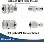 Pressure Washer Quick Connect 3/8" Pressure Washer Fittings Stainless Steel Male Includes 8 pieces adapters. Pressure washer adapter set is made of stainless steel. Anti-rust. High quality and hardness. Quick connect fittings are installed on pressure washer. Applicable for hose, wand, ball valve, etc. They make your cleaning job easier and faster. 3/8 Inch quick connect fittings are great for snap. Very smooth to couple and uncouple. 3/8 Inch NPT thread fittings are well made. Advanced technology to ensure the high precision of thread and no leakage. Max working pressure is 5000 PSI. Put them working on hot and cold water pressure washer. Product Description 1 Fittings 2 Package Item model number RCC03RV Part Number RCC03RV Item dimensions L x W x H 1 x 0.6 x 1.7 inches Size 3/8” Quick Connect Power Source Electric Color Silver Material Stainless Steel Country of Origin China Connector Type Adapter Item Weight 1.25 pounds Thread Type NPT Batteries Required? No Number of Pieces 8 Exterior Finish Stainless Steel Product Dimensions 1 x 0.6 x 1.7 inches Thread Size 0.375 inch Complimentary Shipping and Easy Returns Need to return something? Enjoy our 30-day hassle-free return policy! Take advantage of free shipping across all 48 contiguous states! Your order will be dispatched within 1-2 business days once payment is confirmed. Your Opinion Matters! Your happiness is our main goal! We welcome your feedback! If you encounter any problems, reach out to us right away, and we’ll be here to help. Explore the Extraordinary! Our collection showcases fascinating products that are sure to capture your attention. What surprises await you? Delve in and discover unique items that enrich your daily life. Don't miss the amazing things we have in store for you!