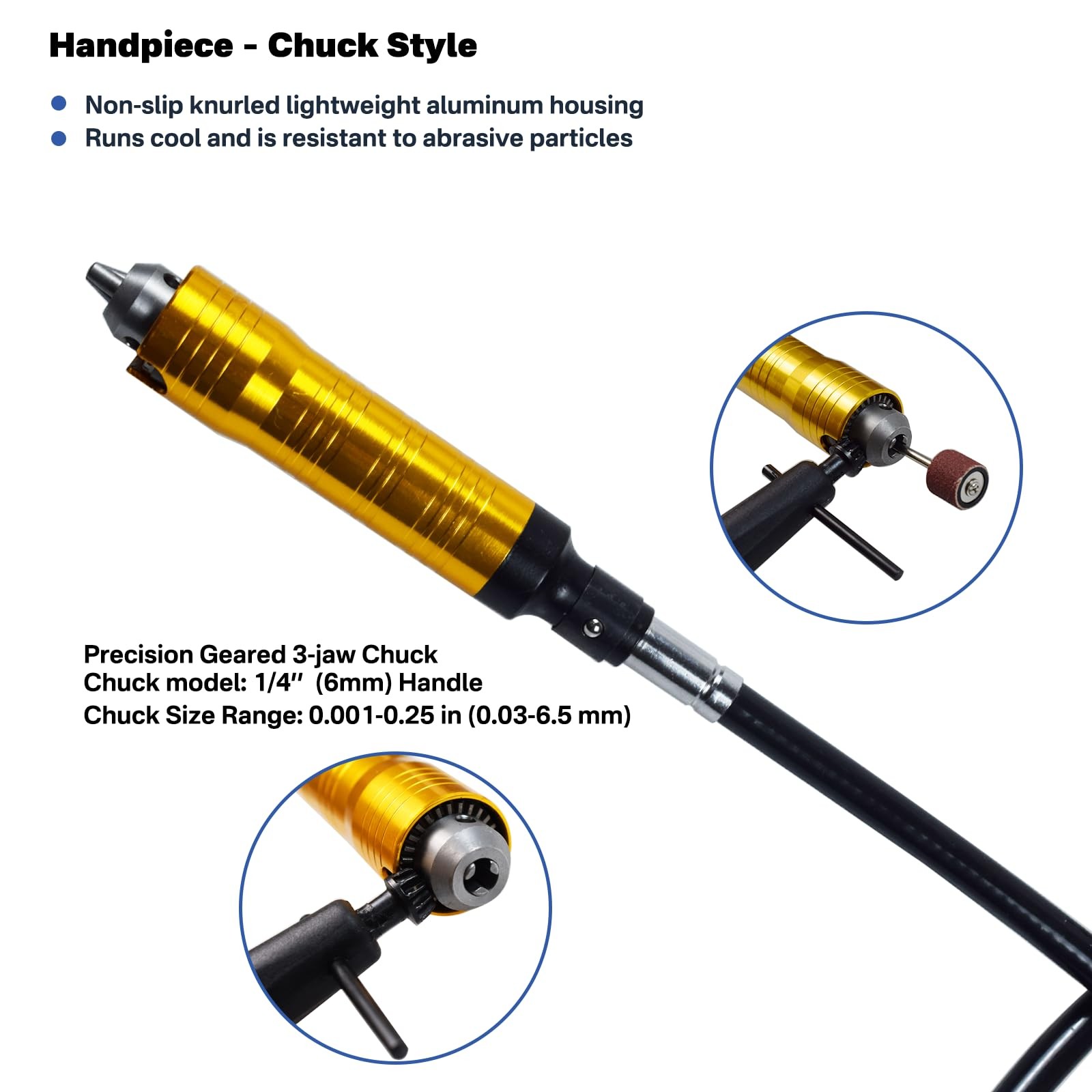 tools are widely used in the jewelry, woodworking, metalworking and automotive industries for their versatility and high precision. These rotary tools can be used for a variety of tasks, including cutting, sanding, grinding, polishing, drilling, etc. rotary tools and flexible shaft machines are manufactured to industrial standards and are renowned for their quality and reliability. A complete flexible shaft machine has a motor that rotates a flexible shaft connected to a precision handpiece, plus – it needs a speed control adjustable by foot. Flex Shaft Grinder Specifications: Rated voltage: 110 V Frequency: 50 Hz Power: 380 W Speed: 500-23000 r/min 3-Jaw Chuck: 1/4'' (6mm) Chunk Range: 0.012-0.26'' (0.3-6.5mm ) Accessories Included: Cutting: Diameter: 15/16" (23.8mm) Cutting Wheels x 36 Shank: 1/8'' (3.2mm) Rotary Tool Mandrel x 1 Sanding Diameter: 1 1/4" (31.8mm) Sanding Discs x 3 Sanding Band x 10 Sandpaper x 36 Mandrel x 1 Cleaning & Polishing Carbon Steel Brush x 2 Dressing Stone x 1 Diameter 1'' (25.4mm) Felt Polishing Wheel x 1 Diameter 1/2'' (15.7mm) Felt Polishing Wheel x 6 Felt Polishing Cone x1 Shank: 1/8'' (3.2mm) Mandrel x 1 Grinding & Sharpening Aluminum Oxide Grinding Stone x 2 Silicon Carbide Grinding Stone x 2 Chainsaw Sharpening Grinding Stone x 2 Why Choose ? 1. Flex shaft rotary tools offer higher power and precision. 2. tool provides greater control and flexibility when working with small and delicate parts. 3. tools are more versatile, with a wider range of compatible accessories and accessories. 4. tools are known for their durability and reliability, making them a popular choice among professionals 380W All-Copper Motor: The powerful 380W motor provides the electric flexible shaft grinder with a wide speed range of 500-23000 rpm, making it the ideal rotary tool for those detailed projects that require precision and power 3 in1 39 in Flexible Shaft: The 39-inch flexible shaft is composed of a plastic shell (protective sheath), an inner flex shaft cable (inner core) and a high-precision three-jaw chuck, which is flexible, safe and stable. (Note: with 1 replacement flex shaft) Upgraded Foot Switch: The variable speed foot controller is made of upgraded ABS material with high strength and toughness that is safer than ordinary materials, and can achieve infinite speed changes, feeling like you are in control of everything. The power cord is extended to 70 in, and the cord for connecting to the motor is extended to 50 in 105pcs Multipurpose Accessories: This flexible shaft grinder comes with many attachments for grinding, cutting, cleaning, polishing, sanding, deburring, grout removal, etc. Cutting wheels, sanding discs, sanding bands, carbon steel brushes, wire brushes, polishing wheels, polishing cones, grinding stone sets, etc. Can meet your different needs Wide Range of Applications: Used for finishing, grinding and adding texture to different materials such as metal, wood, stone, jewelry and more. It's ideal for professionals, craft enthusiasts and DIY enthusiasts at the workbench, workshop and studio