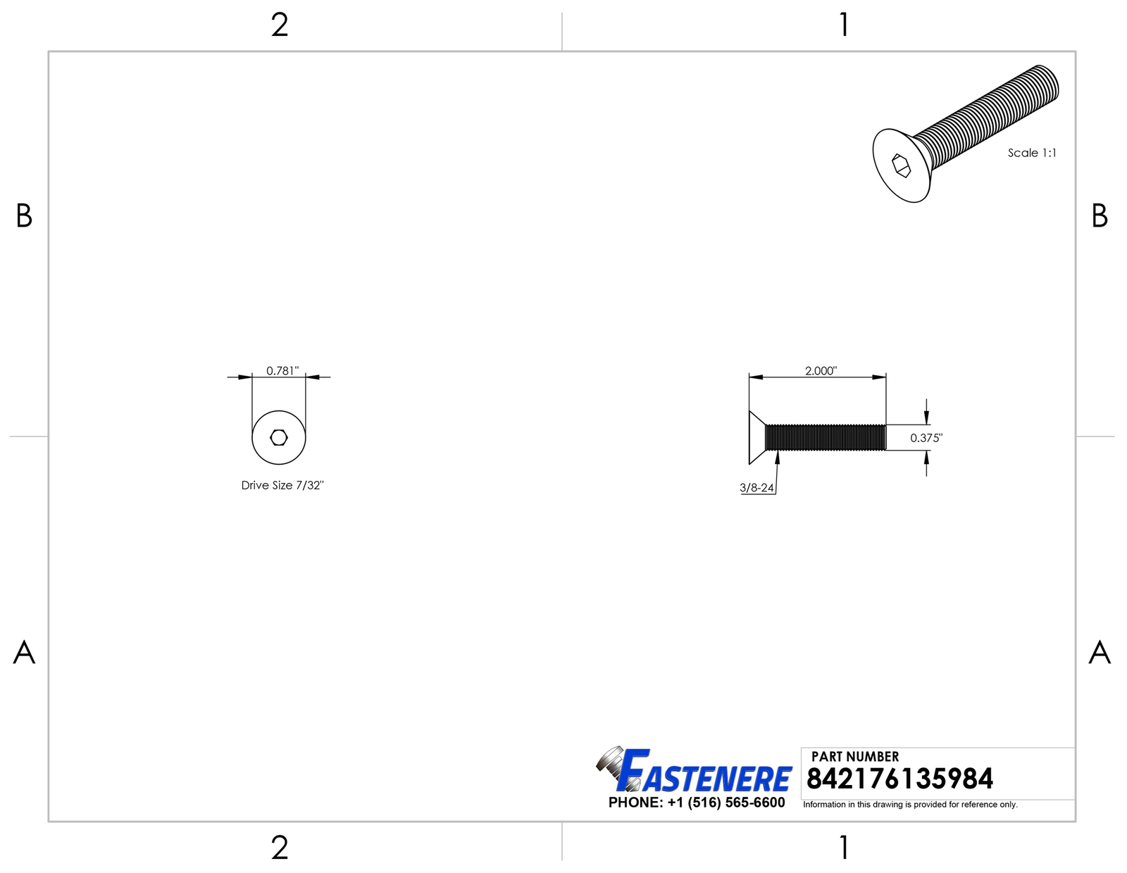 3/8-24 x 2" Flat Head Socket Cap Screws Grade 8 Steel Black Oxide Qty 100 General Product Information Head Style : Flat Drive Style : Allen Hex Key Drive Size : 7/32" Thread : 3/8-24 Overall Length : 2" Thread Coverage : Full Thread Thread Length : 2 Quantity of Fasteners in Package : 100 Material Type : Alloy Steel Grade Rating : 8 Detailed Product Information: Head Diameter : Head Height : 0.234" Countersink Angle : 82 Degree Thread Diameter : 0.375" Threads Per Inch (TPI) : 24 Coarse or Fine Thread : Fine Key Notes: Flat head socket cap screws have a internal hex drive that can be driven with an allen key or hex bit and a machine thread that will match up to any internally threaded item with the same machined thread patern which is apart of the unified thread system Flat head screws have a flat top that tapers down to a cone shape that will sit flush into a countersunk hole and give a finished appearance and an 82 degree flat head which is the most common countersunk screw head angle These flat socket cap screws are a grade 8 equivalent offering a high tensile and yeild strength Black oxide is not a coating but a surface chemical conversion process that offers a mild corrosion resistance Fastenere brand black oxide flat head socket cap screws are treated with a heavy water displacing oil that coats the fastener offering a greater level of corrosion resistance than most other black oxide fasteners Shipping: All orders placed before 3:30 pm EST Will Ship Same Day Tracking is provided on ALL Orders Priority Mail Shipping service is offered at a discount of only $3.95 UPS Ground UPS Next Day Air is available, Please inquire for pricing Returns : ALL returns are accepted if returned within 60 days. Money Back or exchange guaranteed. NO Restocking Fees. For YOU, we constantly strive to find ways of improving our performance.