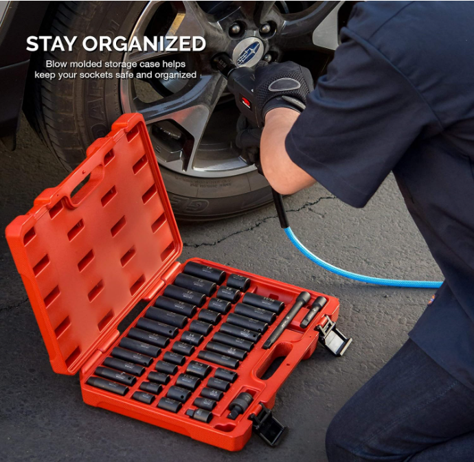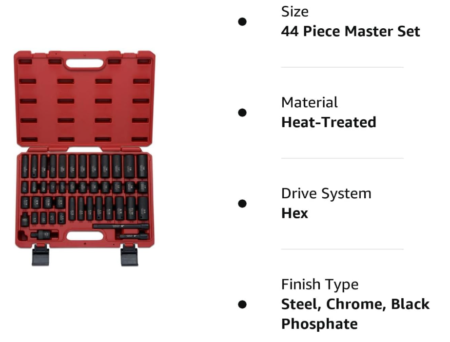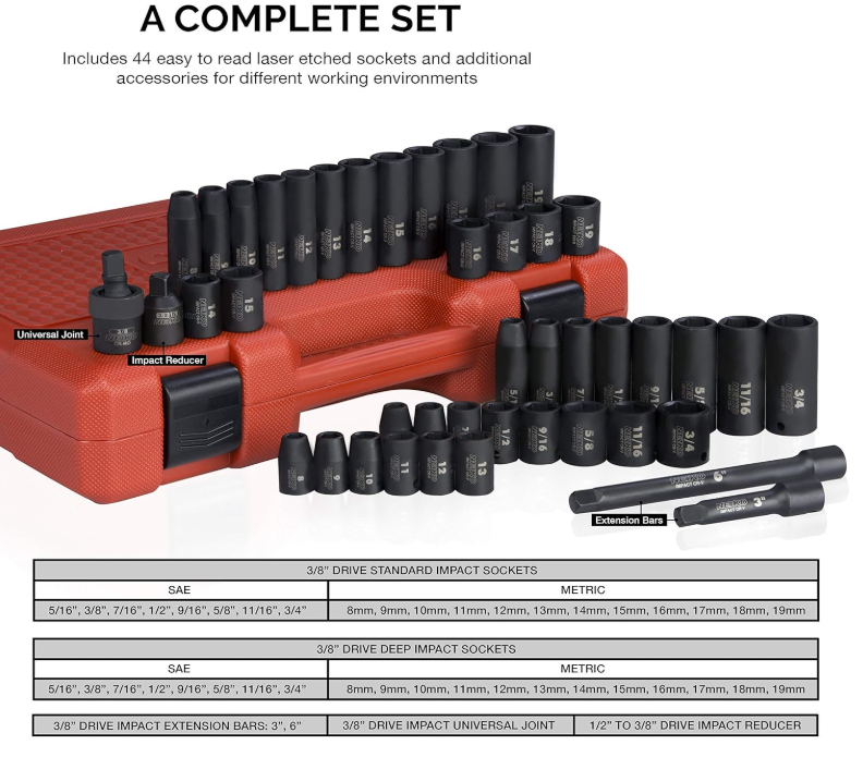 NEW 02440A 3/8-Inch-Drive Impact Socket Set, SAE Sizes 5/16" to 3/4" and Metric Sizes 8 mm to 19 mm, Includes Extension Bars and U-Joint, 44 Pieces About this item METRIC & STANDARD SOCKET SET: Our universal socket set includes both metric and standard sizes to fit any and all measurements you encounter on the job! This socket kit will fill all your tool needs. HEAVY-DUTY IMPACT SOCKETS: Each socket in this 44-piece master kit is constructed with high-impact drop-forged premium CrV steel. The sturdy and professional chrome vanadium construction allows you to take on any project, large or small. 6-POINT HEX DESIGN: The 6-point hex socket design prevents round off on fasteners under high torque exertion from high-impact or electric wrench output. The included socket set case holds each socket for easy transport and storage. EASY-READ SOCKET SET: Each socket has a highly visible laser-etched marking on a black phosphate finish for easy identification of the socket measurement. This design allows for fast application, efficiency, and accuracy in any work space. METRIC & STANDARD SOCKET SIZES: This set includes SAE deep sizes from 5/16" to 3/4" and SAE standard sizes from 5/16" to 3/4". It also includes deep metric sizes from 8 mm to 19 mm and standard metric sizes from 8 mm to 19 mm. A Mechanic Necessity Dependable Strength Our sockets are made from impact grade chrome vanadium steel, giving you the strength you need to loosen those tough fasteners. Complete Set Set includes both shallow and deep sockets as well as additional accessories such as extension bars and u joint adapter so you can access hard to reach fasteners. Stay Organized Sockets come encased in a heavy duty blow mold case for safe keeping when not in use. Great to transport between locations. What's Included 3" and 6" drive impact extension bar 3/8" drive universal joint 1/2" to 3/8" reducer SAE | Deep: 5/16, 3/8, 7/16, 1/2, 9/16, 5/8, 11/16, 3/4"" Standard: 5/16, 3/8, 7/16, 1/2, 9/16, 5/8, 11/16, 3/4"" Metric Sizes | Deep: 8, 9, 10, 11, 12, 13, 14, 15, 16, 17, 18, 19mm Standard: 8, 9, 10, 11, 12, 13, 14, 15, 16, 17, 18, 19mm Product Highlights No More Rounding Off Corners Our innovative 6 point flank drive holds onto fasteners and prevents any rounding off corners. This means your fasteners are protected and so are your sockets. Long Lasting Durability Black phosphate is a coating used on sockets to protect them from all the dirt, oil, and grease that could potentially break down the socket quality. Ours uses a premium black phosphate finish rather than a black oxide coating traditionally found on other sockets. Easy to Identify Stop wasting time and guessing which socket is which. Our high contrast, laser etched markings on the sockets makes it easy for you to spot the right one you need.