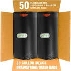 HDPE 1, Product information: BEIDOU-PAC 39 gallon black drawstring plastic can liners, Size: 33.5"*40"x 25.4 mic, Total 50 bags bulk (25 PCS/ROLL , 2 CORELESS ROLLS/CTN), Perfect for 39 Gal Capacity Office, Bedroom and Kitchen Wastebasket trash bins. 2, High-density polyethylene film, sturdy and durable,Unscented, Hygienic and Safe. 3, Convenient drawstring handle with extra thick plastic and double-stitched construction prevents tearing. Sturdy drawstring handle makes the liner easy to lift, tie and carry., flat bottom seal for increased carrying capacity and leak-proof bin liner that won't break or tear easily. 4, Open simply and easily, Coreless rolls in dispenser box for easy use and neat storage, easy to pull apart and easy to open.It can also be used as a gift wrapping. 5, Smart Ideas for Your Home:This black drawstring garbage bag is great for use in various settings such as home, kitchen, bathroom, living room, garden, office waste bins, outdoor bins, and more. Black opaque non-transparent bags Bulk Value Bags, Protection of garbage privacy ,with our bulk options, you'll have plenty of bags for months to come! Product Description BEIDOU-PAC 39 Gallon Balck-Plastic-Drawstring-Trash-Bags for business establishment home Office, Bedroom and Kitchen Wastebasket Cans BEIDOU-PAC 39 GALLON TRASH BAGS Sturdy, leak-proof, odorless trash bags, thick, for bathroom, office and kitchen trash cans. A must-have item for bathrooms, offices, bedrooms, laundry rooms and more. Packed in full boxes for easy storage and no mess Premium Quality and Durable Made from high quality, high density polyethylene raw materials. Reduces energy waste. Strong puncture resistance for maximum daily use. Reduces unnecessary breakage High-Density Can Liners are successfully tested to ensure the highest quality for your daily needs Black ,odorless, convinent drawstring Value Pack Trash Bin Liners Wholesale Quantity Still struggling with a temporary shortage of garbage bags? Still struggling to dispose of trash at your home or business? We provide you with large, high quality bulk boxes of trash bags to solve your temporary confusion and save you a lot of time so you can pay better attention to your family and friends, business activities or traveling. You need a drawstring trash bag that will not run out easily. 50 Counts black trash bags Drawstring 100 Counts black trash bags Drawstring (value pack) Thick (25.4 microns) Well-Sized (85.1cm*101.6cm ) , Able to withstand erosion from waste and remain clean Durable, Convenient and Sustainable - Meet Daily Household or Business Needs Whether it's garbage bags, storage bags for household items and supplies, or the daily needs of a commercial office, whether you're using them at home or traveling outdoors, our quality garbage bags have you covered.