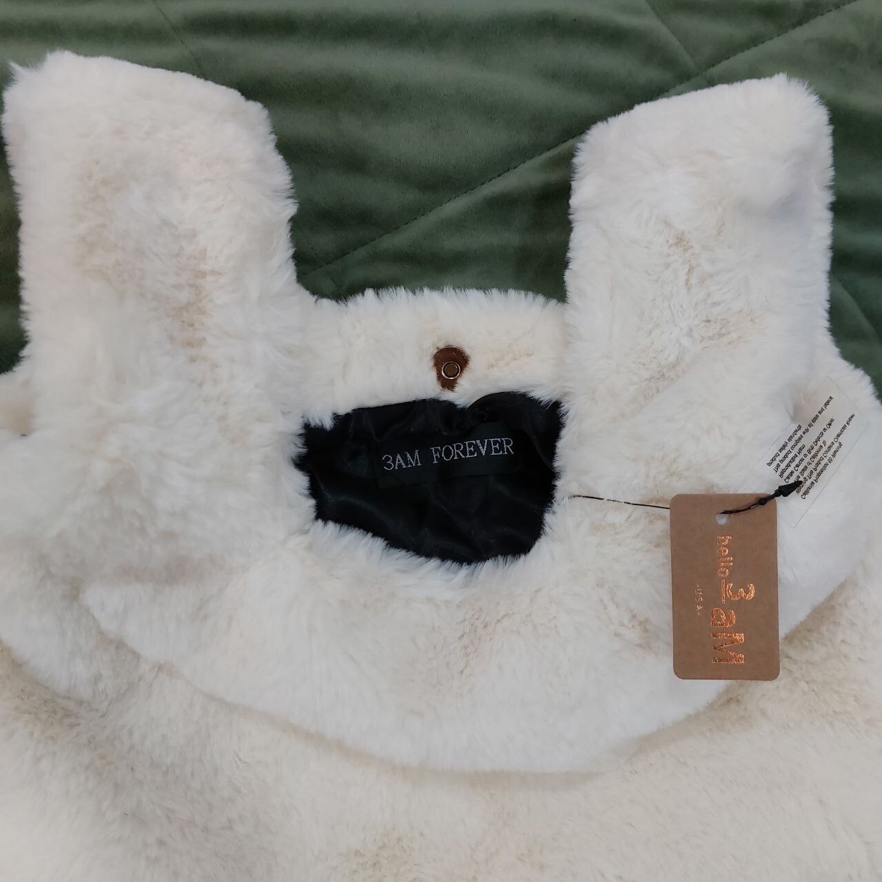 The 3AM Forever Women's Fluffy Eco-Fur White Bag is a stylish and elegant tote designed for women. This small rectangular bag features a solid white exterior made of fur, with a black silk lining. The bag has a button closure and gold hardware, adding a touch of sophistication. Perfect for parties, cocktails, or casual occasions, this bag is a fashionable accessory that adds a touch of luxury to any outfit. Made in the United States by the brand Forever, this bag is both practical and chic for any fashion-forward woman.