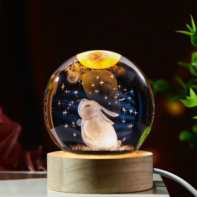 3D Carved Rabbit Crystal Ball Night Light with Wooden Base - Soothing Kids Gift & Healing Decor