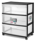 The Sterilite 3 Drawer Wide Cart offers a practical and versatile storage solution for any room of the home! Organize a variety of household items where they are most frequently used - in the bedroom, kitchen / pantry, bathroom, craft room, nursery or dorm room. It can even double as a nightstand, dresser or way to make efficient use of closet space. Neatly store anything from clothing, accessories, and towels to craft supplies, health and beauty items, toys, and more. The drawer design features an integrated handle for easy opening and is clear, allowing contents to be easily identified, while keeping them contained. The drawer stop feature prevents drawers from being removed accidentally. Add the casters to create a rolling storage option, and easily move the Drawer Cart wherever it is needed. It's easy to get organized and keep your living spaces clutter-free with the 3 Drawer Wide Cart! The overall assembled dimensions of this item are 15 1/4" D x 21 7/8" W x 24" H. Outside Dimensions: 15 1/4" x 21 7/8" x 24" Single unit option Black Interior Dimensions at bottom of drawer: 19 1/8" x 13 1/4" x 7" Assembled Cart Height, with Casters: 25 5/8" Multi-purpose and versatile storage option for any room of the home Clear drawers allow contents to be easily identified Easy pull out handles with drawer stops to prevent drawers from being removed accidentally Casters are included to create a portable storage solution off