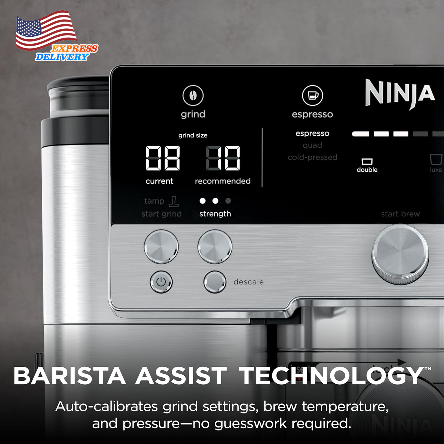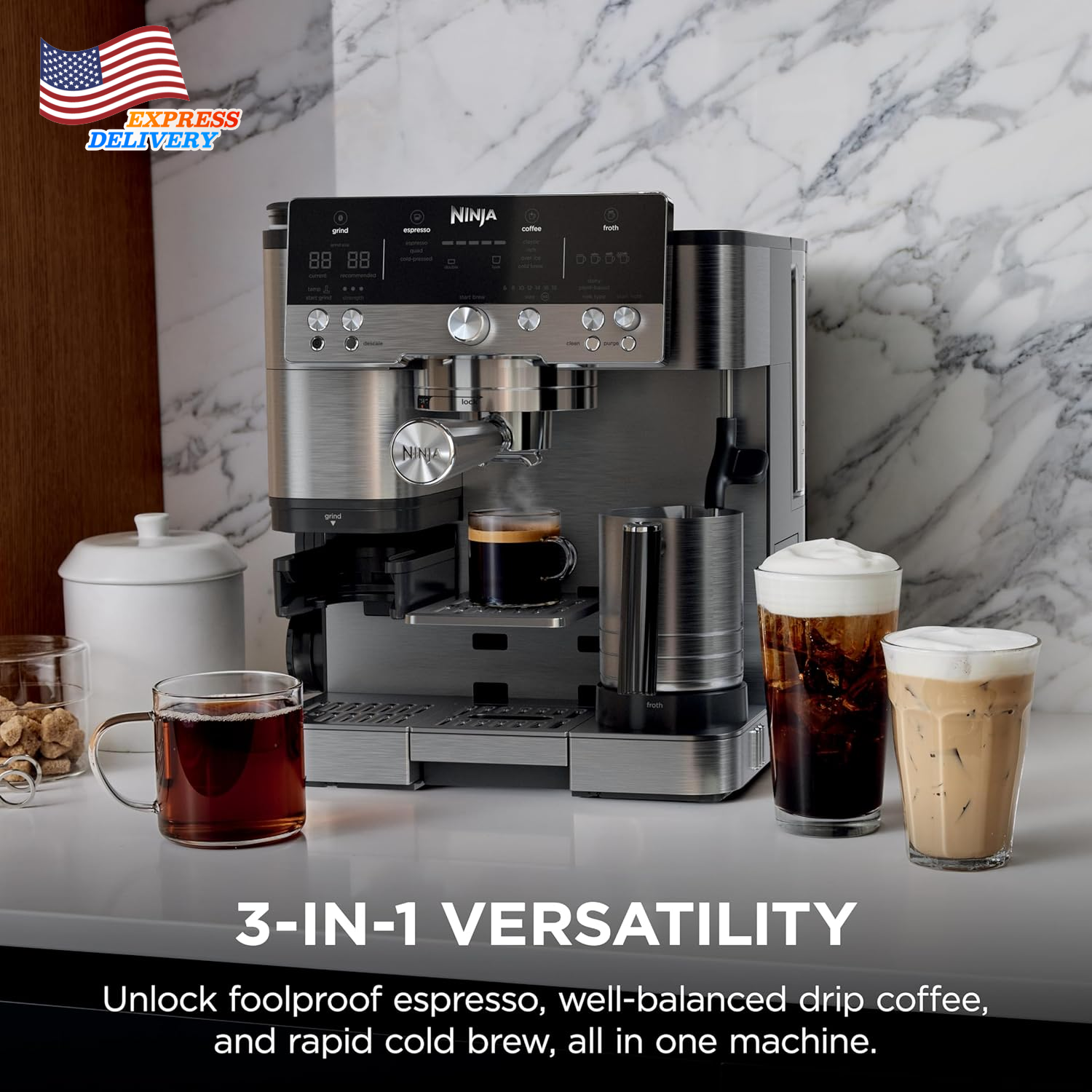 Store New Arrivals Add to Favorite View Feedback Contact 3-In-1 Espresso Drip Coffee and Cold Brew Machine Coffee Grinder Milk Frother US Description Item model number ES601 Unit Count 1.0 Count Style Luxe Cafe Capacity 4.4 Pounds Customer Package Type Standard Packaging Color Stainless Steel Product Dimensions 12.99"D x 13.39"W x 14.57"H Is Dishwasher Safe Yes Specific Uses For Product Cappuccino, Espresso, Iced Coffee, Latte, Mocha Item Weight 31.8 pounds Batteries required No Operation Mode Fully Automatic Human Interface Input Buttons Voltage 120.0 Model Name ES601 Global Trade Identification Number 10622356635162 Coffee Maker Type Espresso Machine Special Feature Auto Shut-Off, Dishwasher Safe Parts, Milk Frother, Programmable, Timer Number of Items 1 3 MACHINES IN 1: Brew without limits with no guesswork espresso, well-balanced drip coffee, and rapid cold brew. 2 Espresso Styles — double shot or quad shot, 3 Drip Coffee Styles—classic, rich or over ice, and 2 Cold Brew styles— cold pressed espresso or cold brew coffee (drip coffee and cold brew available in 6, 8, 10, 12, 14, 16, 18 oz. sizes). BARISTA ASSIST TECHNOLOGY: Unlock the ultimate guided experience with customized grind size recommendations, weight-based dosing, and active brew adjustments for temperature & pressure for balanced flavor, deliver café-quality brews, no guesswork required. INTEGRATED GRINDER: The conical burr grinder has 25 grind settings to deliver a fresh, precise grind for versatile drink options for every type of bean. WEIGHT-BASED DOSING: Different drinks require different amounts of grounds. Our built-in scale does the work for you with weight-based dosing tailored for your chosen drink. Other machines simply grind for a set amount of time, and you need to manually weigh your grounds. HANDS-FREE FROTHING: Whether using dairy or plant-based milk, creating hot or cold microfoam, the Dual Froth System combines steaming and whisking at the same time to effortlessly create perfectly textured microfoam. Removing the trial-and-error from manual frothing with 4 preset programs including steamed milk, thin froth, thick froth and cold foam FLAVORFUL COLD-PRESSED DRINKS: Espresso brewed at lower temperature and pressure, at a slower pace to extract a more flavorful, smooth brew. Perfect for creating a crowd-pleasing espresso martini. PERFECT PUCKS: Assisted tamper delivers the perfect puck with evenly distributed and compact grounds, ensuring ideal conditions for even water distribution that results in a bold, high-quality shot. BUILT-IN STORAGE: Conveniently store the tamper and funnel on the side of the machine when not in use, and keep brew baskets, brush, and cleaning disc in the built-in storage compartment. WHAT’S INCLUDED: Portafilter, Milk Jug, Double Basket, Luxe Basket, Assisted Tamper, Cleaning Brush, Cleaning Disc, Funnel, Descaling Powder, Cleaning tablets, Hard Water Testing Kit, Instructions & Inspiration Guide. Ninja is the #1 Best Selling Espresso Maker in 2025 Year to Date. Source: Circana, LLC, Retail Tracking Service, Espresso Makers, Model ES601, Dollar Sales, Jan 5 2025 – Sep 27 2025 The ultimate guided experience that makes espresso uncomplicated. The Ninja Luxe Café Premier Series is an intelligent espresso & coffee system with unmatched 3-in-1 versatility (no guesswork espresso, well balanced drip coffee and rapid cold brew), that helps you elevate your coffee routine and create café-quality drinks at home. Barista Assist Technology guides you to the perfect cup from grind size recommendations to automated brew adjustments, while the Dual Froth System effortlessly creates perfectly textured microfoam hands-free. ABOUT US We offer the best prices around on high quality products. Our E-store includes media such as books, movies, music and games while offering electronics, toys, sporting apparel, clothing, tools, general home, garden items and more. SHIPPING We are always working hard to ensure your package arrives as soon as possible. Please understand that some factors like weather, high postal traffic, and the performance of shipping companies are outside of our control. We offer free shipping to the lower 48 states and ship within 2 business days of payment, usually sooner. We do not accept P.O. Boxes. Please provide a physical address. For shipping outside of the continental USA, we only use eBay's Global Shipping Program.The item is shipped to KY and then sent to the rest of the world. International customers are responsible for all duties and taxes. Continue to check out in order to calculate costs for shipping the item to your country. Messages regarding eBay's Global Shipping Program MUST be directed at eBay EXCLUSIVELY. RETURNS We offer a 30-Day Return Policy on items which you are not completely satisfied with. You have the option for a full-refund or an exchange of the item. No returns are available on items shipped outside of the USA. PAYMENT We accept PayPal. CONTACT US This page content is yet to come Please ad us to your favorite seller and visit again later Thank You CUSTOMER SATISFACTION We try our very best to make sure every customer is completely satisfied. If there's a problem, message us! We're happy to help. WE ACCEPT Copyright © 2021 AutoDS. | All Rights Reserved