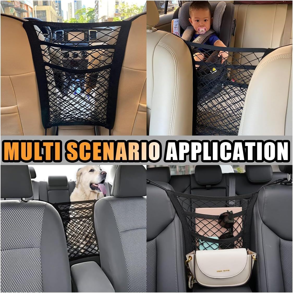 【Reliable Material】:The car backrest net bag is made of high-quality polypropylene fiber material, wear-resistant and dirt-resistant, the mesh surface is highly elastic and stretchable, pulling is not easy to deform, to meet your storage needs, can be used as a must-have item when you are traveling by car. 【Safe Driving】:The car mesh pocket can be used as a barrier between the front and back seats of your car to keep pets or children out of the back seat area, reducing their interference and protecting your driving safety. 【Easy to Install】:The car net organizer bag comes with four high-quality hooks, simply hang the four hooks on the appropriate positions on each side of the seat. Note: After installation, please check whether the fixing position is firm or not, so as not to fall off and cause damage. 【Widely Applications】:Fits most cars, trucks, SUVs and other vehicles with headrest bars. The car mesh pockets can hold most medium-sized items such as cell phones, wallets, rainwater, paper towels, etc. It is a great help for you to store and organize your items. Note: Not suitable for storing items larger, heavier or smaller than the mesh pockets. 【Size of Organizer】:Includes 1 car net organizer. Size is approximately 10.15×11.61 inches and stretches to 16.53×15.74 inches (with two pockets), which meets the needs of most cars. Note: Before purchasing, please make sure the length of the mesh bag matches your vehicle.