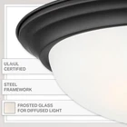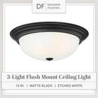 FLUSH MOUNT LIGHT COVER: This sleekly modern overhead light fixture features a durable steel construction with a sleek matte black finish, and a beautiful etched glass shade for soft diffuse light and a professional and sophisticated aesthetic suitable for a wide range of home decors; ideal for indoor lighting fixtures VERSATILE USE: Perfect for a wide range of home settings, this round light fixture is ideal for adding illumination and a touch of class to your kitchen, bathroom, bedroom, dining room, hallway, entry way, stairwell, laundry room, closet, and much more; compatible with standard wall dimmers EASY INSTALLATION: This dome light fixture includes mounting hardware to allow for quick and easy installation, and the close to ceiling light fixture also allows for easy bulb replacement DURABLE CONSTRUCTION: Our light covers are constucted with a strong and sturdy steel construction to provide long-lasting and reliable lighting, and feature etched glass to add a touch of elegance and sophistication to any room SPECS: Our ceiling light fixtures measure 15.25 W x 15.25 D x 5.5 H in inches, and are suitable for use with three medium base 60W LED or incandescent bulbs (Bulbs not included); flush mount ceiling lights are cULus certified for use in dry indoor areas and backed by a 1 year warranty Add bright interior illumination and a touch of elegance to your home with our DESIGNERS FOUNTAIN ceiling mounted light fixture. Constructed with durable long-lasting steel and sleek etched glass, this ceiling mounted light fixture cover is great for adding a touch of class and sophistication to your home decor, and is perfect for use in bathrooms, bedrooms, stairwells, hall ways, utility rooms, or even the entrance to your home. This interior light fixture includes the necessary mounting hardware to allow for easy installation onto ceilings, and the flushed ceiling light also allows for easy bulb replacement. Our simple light fixture measures 15.25 W x 15.25 D x 5.5 H in inches, and is suitable for use with three 60W LED or incandescent bulbs (Bulbs not included). This round ceiling light is cULus certified for use in dry indoor areas, and backed by a 1 year warranty. Enhance your home's lighting with this elegant and contemporary light fixture.