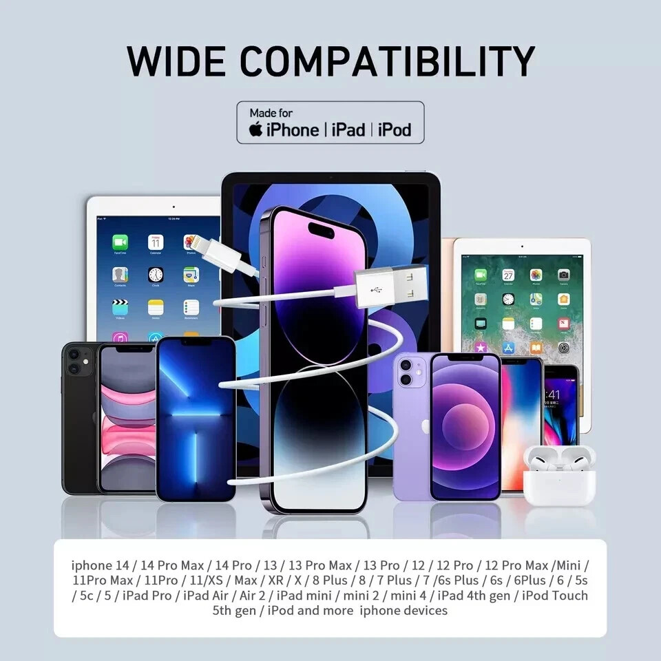 Perftect Performance: MFi Certified manufacturer brings you new experience-fast charging 2.4A and stable data transfer up to 480 mb/s,Lightning Charger Cable use authorization chip to ensure 100% compatibility with newest iOS syetem. Faster Charging & Sync: 20% Faster than other iPhone charging cords - After long-term testing for IOS lightning cable, we selected four-core higher quality copper wires to make, which makes charging faster and more stable. You can enjoy fast charging [2.4A] and high-speed data transferring [480Mbps]. Superior Durable iPhone Cable:20X more durable and sturdier than original iPhone charging cables - Our iPhone USB cable are made of military grade material and space aluminium alloy, withstand at least 20,000 plugging and unplugging lifespan and 20,000 bending cycles. Flexible and tangle-free, meet all kinds of daily connection needs and long-term use. 100% Perfect Compatibility:Our iPhone USB lightning cables works seamlessly with any new iPhone iPad, including iPhone 12 iphone 11 Pro Max SE X XS XR 8 8Plus 7 7Plus 6S Plus 6 5S 5C 5, iPad air mini pro, iPod and more. Compact lightning connector head design ensure that the iPhone charger cable fit most phone cases and accessories. Service & Value 3Pk 6Ft iPhone Cables:Our 6ft lightning cable is enough long to use whether in office, car or at home, you can enjoy safety fast charging anytime & anywhere. All iPhone iPad lightning cable provide 12 months professional customer service support.