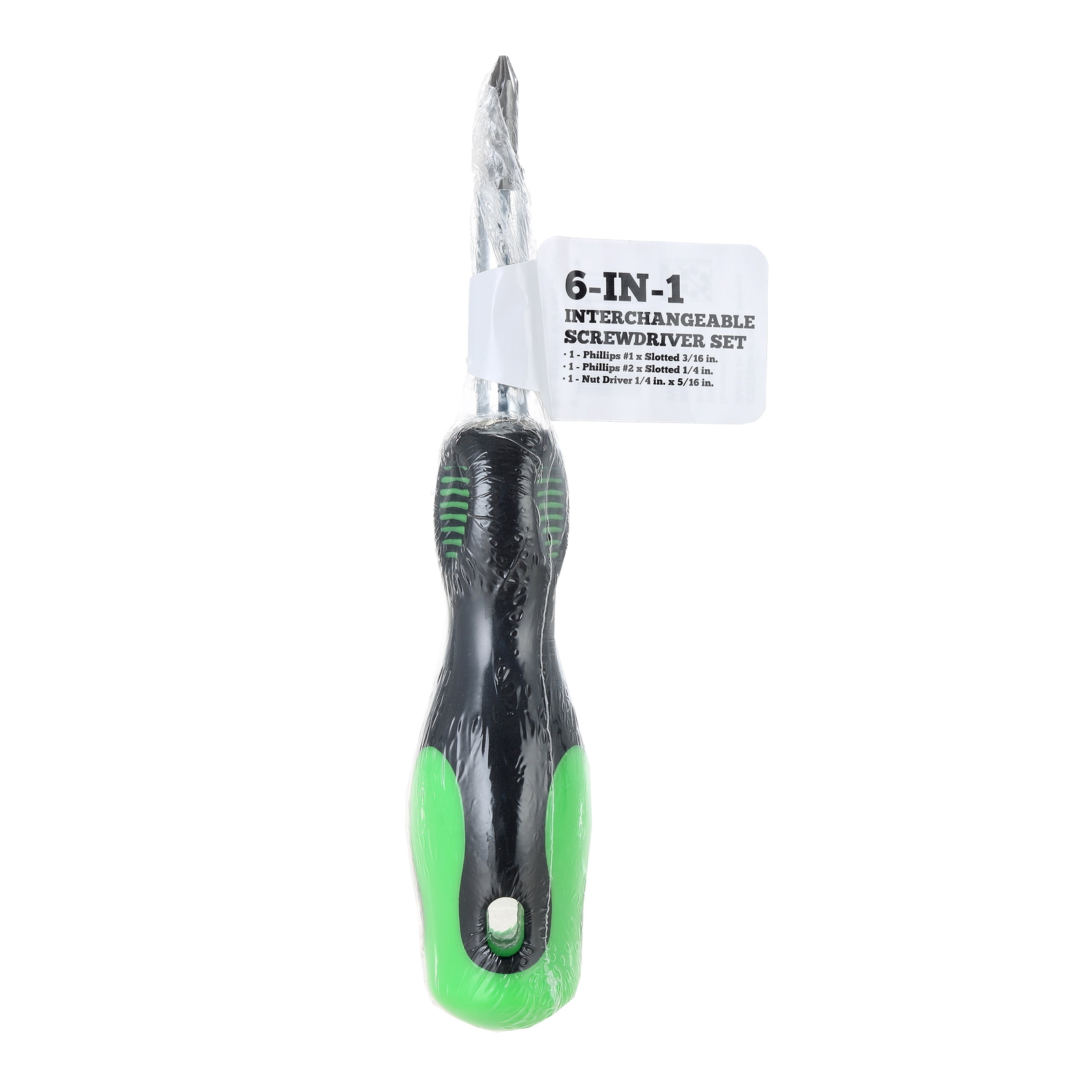 The New 6-In-1 Interchangeable Screwdriver is great for projects and is easy to use. Includes 6 different screwdriver bits that connect easily to the handle. Perfect tool for the do-it-yourselfer and the professional. This Screwdriver has a ergonomic handle for a nonslip grip. This included 2 double ended bits and a double ended nut driver. This screwdriver weighs about 1.5 lbs. SET INCLUDES: DOUBLE END BITS SLOTTED 3/16" AND PHILLIPS 1-SLOTTED 1/4" AND PHILLIPS #2 , NUTDRIVER SHAFT HAS 1/4” AND 5/16” HEX SIZES HARDENED STEEL SHAFT BITS FOR STRENGTH AND DURABILITY TRIANGULAR HANDLE WITH SOFT GRIP PREVENTS ROLLING AND OBTAINS MAXIMUM TORQUE Great for any toolbox