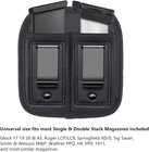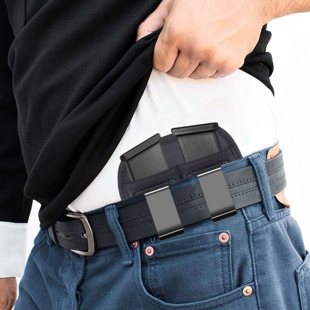Universal Fit - IWB magazine holster fits most Double, Single Stack Magazines 9mm / .40 / .45 / .380 / .357, Glock 17 19 22 26 27 42, Sig Sauer, Ruger LCP/LC9, Springfield XDs & XDM, Smith & Wesson M&P, Walther PPQ, HK VP9, and Similar Sized Magazine. Maximum Comfort Guarantee - Our magazine holster is equipped with a strong metal belt clip is made out of padded and breathable surgical grade elastic neoprene with air holes that allow ventilation for your waist – you'll forget you have it on! The soft foam innards of the holster will prevent rubbing and discomfort. Easy To Use - Built with a strong metal belt clip for keep the mag holster secure on your waist belt, easy to put on and take off. Ambidextrous Design – Suitable for both left-handed and right-handed, convenient to take the mags out quickly. Quick Draw And No Printing Guarantee - Universal holster allows you to draw the mag quickly and effectively. Also, you can walk, jump, work out, and even run with this IWB mag holster's sturdy metal belt clip without any movement of your clip. The sleek design of this holster allows you to carry concealed discreetly with no possibility of magazine showing through your pants (printing). Product Description Universal Double Magazine Holster/Mag Pouch Universal Fit Product Feature Multiple Use and No Printing Perfect for multiple uses:little flashlight,OC pepper spray,and magazines Durable Metal Clip, Rest over Any Size Pant Belt to Hold Securely in Place. Allows you to carry concealed discreetly with no possibility of magazine showing through your pants (printing)