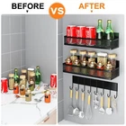 Magnetic Spice Rack for Refrigerator: Aufworld Magnetic Spice Racks Set comes with 2 separate shelves and an 8 hook rack, which is more diverse in the market. Practical 8-hook hanger can be hung with various laundry supplies or kitchen utensils like cup, scissors, apron, towels etc. Super Magnetic Design with Strong Load-bearing Capacity: Our Fridge Spice Rack Magnet Organizer has a widened magnet attached on the back. With strong magnetic force, the bigger magnetic shelf can hold 11 pounds and the small one can hold 6.6 pounds. The 8-hook rack can hold up to 4.4 pounds. Practical Design: Our magnetic shelf for refrigerator have rounded corners design, which is safe and comfortable use experience. 1.77 inch guard rail will prevent items from falling and make storage cleaner. The hollow drainage ventilation design, mildew and rustproof. Easy to Install: No tools needed, simply attach these magnetic fridge spice racks and start organizing your space-saving spice shelf organizer with ease. No need to worry about your magnetic spice rack falling off, these magnetic rack have a strong magnetic hold to securely attached to the side of refrigerator or other iron surfaces. Multi-Use Magnetic shelves: Can be used on all magnetic surfaces of your home and kitchen, such as the side wall of your refrigerator to hold spices, oils, utensils, plates, mugs, towels or other essentials. Our moveable magnetic fridge organizer can also be used on the side of an oven, microwave or washing machine for storage.