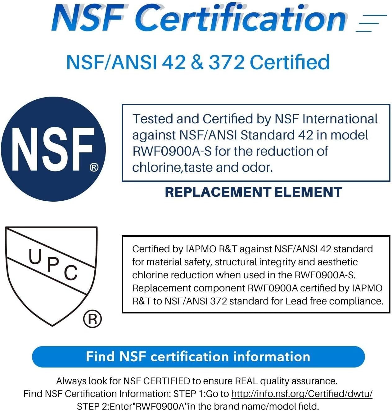 Tested and Certified by WQA accords to NSF/ANSI42 for material safety and chlorine reduction. Certified Drinking Wtaer Treatment Units - NSF/ANSI 42 by NSF and WQA - Filters are certified to reduce aesthetic impurities such as chlorine and taste/odor. Certified Lead Free Products - NSF/ANSI 372 by NSF and WQA - For Materials Safety and Structural Integrity Capacity: 1150 liters(300 Gallons) Operating Conditions Temperature: 1-38 C Flow Rate: 0.5 GPM(1.9 LPM) Pressure: 30 -125 PSI(207-862 kPa) This product compatible with Samsung DA29-00020A DA29-00020B HAF-CIN HAF-CIN-EXP RF24FSEDBSR RF24FSEDBSR/AA RF25HMEDBSR RF260BEAEBC RF260BEAESP RF260BEAESR RF260BEAEWW RF261BEAESP RF261BEAESR RF261BEAEWW RF263BEAEBC RF263BEAESP RF263BEAESR RF263BEAEWW RF263TEAESR RF31FMEDBSR RF31FMESBSR RF323TEDBBC RF323TEDBSR RF323TEDBSR/AA RF323TEDBWW RF32FMQDBSR RF4267HARS RF4267HAWP RF4287HABP RF4287HARS RF4287HARS/XAA RF4289HARS RFG296HDRS RFG297HDRS RFG298HDBP RFG298HDRS RH29H9000SR RS261 RS261MDBP RS261MDRS RS261MDWP RS263TDBP RS263TDRS RS265 RS265TDBP RS265TDRS RS265TDWP RS267TDBP RS267TDRS RSG307AARS This filter replaces Samsung DA29-00020B,DA29-00020A,HAF-CIN,HAF-CIN-EXP, HAF-CINEXP,HAFCIN,04609101000,09101,46-9101,469101,DA-97-08006A,DA-97-08006A-B,DA-97-08006B,DA29-00019A,DA2900019A,DA2900020A,DA2900020B, DA97-08006A-B (not original)
