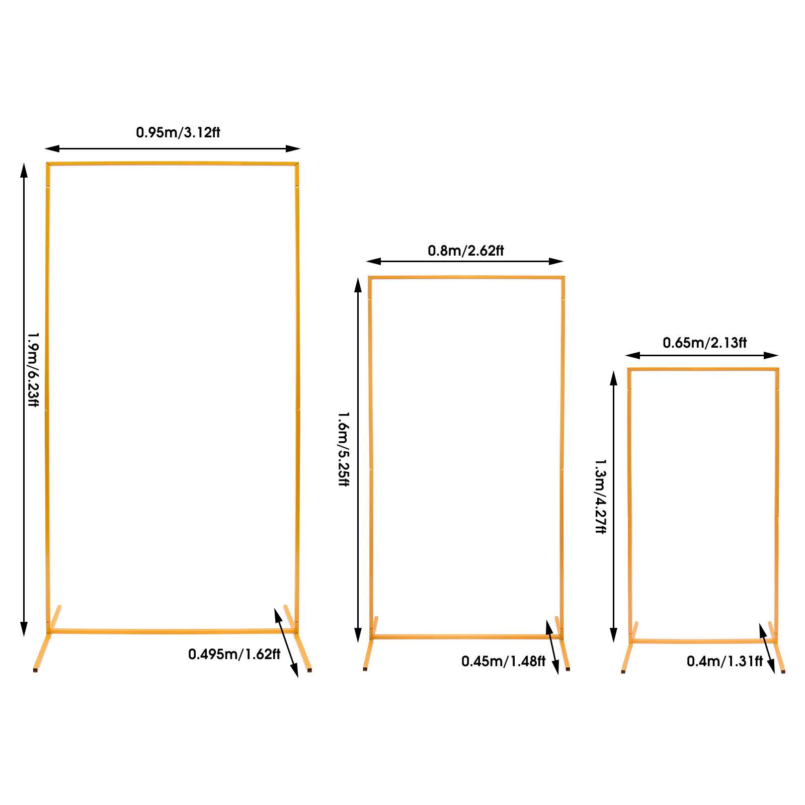 Specifications Color: Gold Material: Steel Tube Style: Modern Process: High-temperature Baking Paint Mount Type: Free Standing Number of Items: 3 Assembly Required: Yes Load-bearing Capacity: About 10kg/22.05lbs(3.12*1.62*6.23ft), 8kg/17.64lbs(2.62*1.48*5.25ft), 5kg/11.02lbs(2.13*1.31*4.27ft) Products Size: 0.95*0.495*1.9m/3.12*1.62*6.23ft, 0.8*0.45*1.6m/2.62*1.48*5.25ft, 0.65*0.4*1.3m/2.13*1.31*4.27ft Package Size: 98*18*7cm/38.58*7.09*2.76in Gross Weight: 6kg/13.23lbs Net Weight: 5.8kg/12.79lbs 3Pcs Rectangular Balloon Frame Wedding Stand Gold Metal Backdrop Stand For Party Description Our gold wedding stand will use its pleasing color and delicate design to create a romantic and dreamy wedding scene for you. With its stable and sturdy structure, you can feel free to embellish it with various decorations such as floral arrangements, balloons, and curtains to make your wedding scene shine. Key Features Sturdy and Durable: The steel tubes with a high-temperature bake paint process can protect the products from corrosion, rust, and abrasion and keep it beautiful and practical for long-term use. Excellent Wedding Decoration: Its elegant gold color with bouquets, balloons, gauze curtains, and other kinds of decorations (not included) will create an elegant, beautiful, and romantic atmosphere for your wedding site, making the wedding memorable and happy memories. Strong Structure: The thickened tubes and sturdy feet provide it with a strong load-bearing capacity (11.02 lbs, 17.64 lbs, about 22.05 lbs) that allows you to place backdrop items such as flowers and balloons with confidence. 3 Pieces a Set: The package includes 3 pieces of products of different sizes (3.12*1.62*6.23ft, 2.62*1.48*5.25ft, 2.13*1.31*4.27ft), providing you with various solutions for decorating your wedding, party, or other events. Great Background: The appropriate heights of 4.27 ft, 5.25 ft, and 6.23 ft make it a striking background for photography, which can make the photos more exquisite. Plant Stand: You can place it in the area where climbing plants are planted, which will help the plant grow. The lush plants surrounding it will form a beautiful landscape to decorate your garden well. Effortless Clean: With a simple structure and smooth surface, you can easily wipe it clean with a damp cloth. Simple Assembly: The English diagram and complete accessories allow you to assemble it with less time and effort. Easy to Carry and Store: The three pieces of stands are lightweight (total is 12.79 lbs) and can be disassembled after use, so you can easily carry them outside or store them in your warehouse when not in use. Protective Package: The bubble bag can better protect your products during transportation so that they ca n be delivered to yo u completely to the greatest extent. Customer Service: We aim to provide quality products and services. If you have any problems, please feel free to contact us. We will reply and solve the problem for you as soon as possible. Details Wing Nuts: They are convenient for you to tighten the item by hand, making it less likely to wobble or sway. Rounded Corners: Round edges and corners provide a comfortable touch to better care for your skin. Application It is suitable for weddings, birthday parties, Christmas parties, happy Valentine’s Day decorations, banquets, anniversary celebrations, school opening ceremonies, graduation party decorations, bachelor parties, photo booth background decorations, store openings, and other special events that you want to decorate. Specifications Color: Gold Material: Steel Tube Style: Modern Process: High-temperature Baking Paint Mount Type: Free Standing Number of Items: 3 Assembly Required: Yes Load-bearing Capacity: About 10kg/22.05lbs( 3.12*1.62*6.23ft ), 8kg/17.64lbs( 2.62*1.48*5.25ft ), 5kg/11.02lbs( 2.13*1.31*4.27ft ) Products Size: 0.95*0.495*1.9m/3.12*1.62*6.23ft, 0.8*0.45*1.6m/2.62*1.48*5.25ft, 0.65*0.4*1.3m/2.13*1.31*4.27ft Package Size: 98*18*7cm/38.58*7.09*2.76in Gross Weight: 6kg/13.23lbs Net Weight: 5.8kg/12.79lbs Package Included 3* Wedding Stands 1* English Installation Diagram Notes Please check the size carefully before ordering. Please install it in strict accordance with the diagram. Please note that flowers and other decorations are not included. Please note that children are not allowed to climb on this stand. Payment Delivery details Terms of sales About us Contact us Payment We accept ebay payment 。 Fees such as import duties, taxes are not included in the item price or shipping costs. These charges are the buyer's responsibility. Delivery details Shipping: 2-9 working days to: USA Terms of sales We maintain high standards of excellence and strive for hundred percent customer satisfaction. Feedback is very important to us. We hope that you contact us immediately before you give neutral or negative feedback, so that we can address your concerns. It is impossible to address issues if we do not know about them! About us Your satis faction is our ultimate goal. We work hard to earn your trust and future business. Our certified technicians have tested each item before shipping. The unit comes with 1 year limited warranty on all manufacturing defects. a) If you receive a defective item, you may return it or ask for a discount. Please contact us within 14 days after you receive the package. b) What you returned must be intact and in its original packaging as re? u. Customer is responsible for shipping costs of the returned item. c) We will cover the cost of shipping back t with the shipping rate indicated in the registration page. We will send you a new unit or refund the full payment you paid. Thank you. Contact us Business Hour Business Hour: Monday To Friday: 8:30 AM to 5:00 PM (Beijing China time) Due to time zones, our reply to your questions may not be immediately. But within above working time, we will reply your email within 24 hours. If it's non-workdays, please kindly be patient and wait till Monday. Please contact us wit