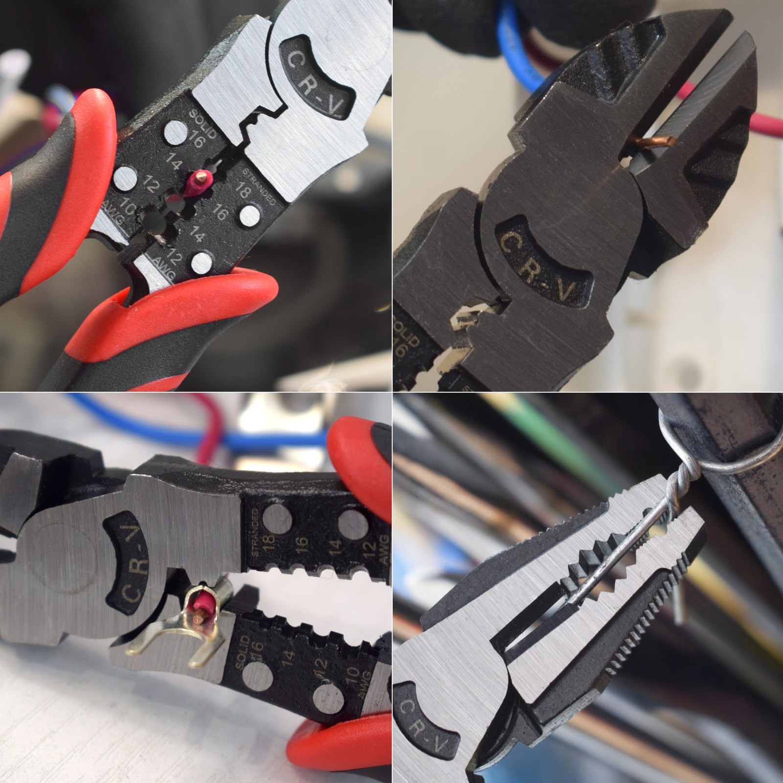 HIGH-QUALITY MATERIALS: The pliers tool set forged from high-quality chrome vanadium steel, the hardness is as high as HRC:58-62, the surface is hand-polished and polished. And the product is exquisitely crafted. It is an excellent multi-functional pliers toolset. 5 IN 1 FUNCTION: Pliers have multiple functions, such as easy winding, fast cutting, simple peeling, tight crimping, tightening, and unscrewing. One plier has 5 functions.Contains needle nose pliers, cutting pliers, wire stripper tool, It saves time and makes work more efficient. LABOR-SAVING DESIGN: The pliers kit are ergonomically designed, and the grips are made of PVC handles, which are comfortable to use. The eccentric and labor-saving design saves hand power when using and makes the operation more convenient. WIDE RANGE OF USES: The pliers tool set used in machinery, household appliances, automobiles, electricians, etc. It can cut 4mm copper wire, iron wire, and 2mm steel wire. PACKAGE CONTENT: A side cutting plier, a combination plier, a needle nose plier, and a storage bag for better storage and carrying.Polyvinyl Chloride (PVC)