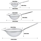 Highlight description: 【3 Fine Mesh Strainers Set】You will get 3 pieces of fine mesh strainers in different sizes, the diameters are respectively 3 inch, 5.5 inch and 7.9 inch, meeting your different needs in kitchen. 【Durable Material】These flour filters are made of stainless steel, rustproof and corrosion-resistant, easy to clean and durable. Fine mesh ensures a better filtering effect and avoids the food from dropping. 【Long Handle】Each wire sieve sifter is designed with a long handle, which provides comfortable grip and prevents your hands from getting scalded when catching hot food. 【Convenient Hanging Hole】There is a hole on the top of the metal strainer for you to hang it up conveniently, it also keeps your kitchen tidy and in organization. 【Practical Kitchen Gadget】The stainless steel colander sieve sifter can not only be used for straining pasta, but also for a variety of tasks such as rinsing grains and beans, and fruits and straining pasta, rice, lentils, jams, lumpy sauces and any other food preparation. Detailed description: Material: Stainless Steel Color: Silver Size: S: 8 cm diameter, 3.15 inch wide, 1.38 inch deep, 4.33 inch handle M: 14 cm diameter, 5.31 inch wide, 1.97 inch deep, 5 inch handle L: 20 cm diameter, 7.76 inch wide, 2.36 inch deep, 5.83 inch handle Notes: 1. Please allow slight deviation due to manual measurement. 2. There may be slight chromatic aberration due to the difference between different lights and monitors, please understand. Parts List: 3 x Fine mesh strainers