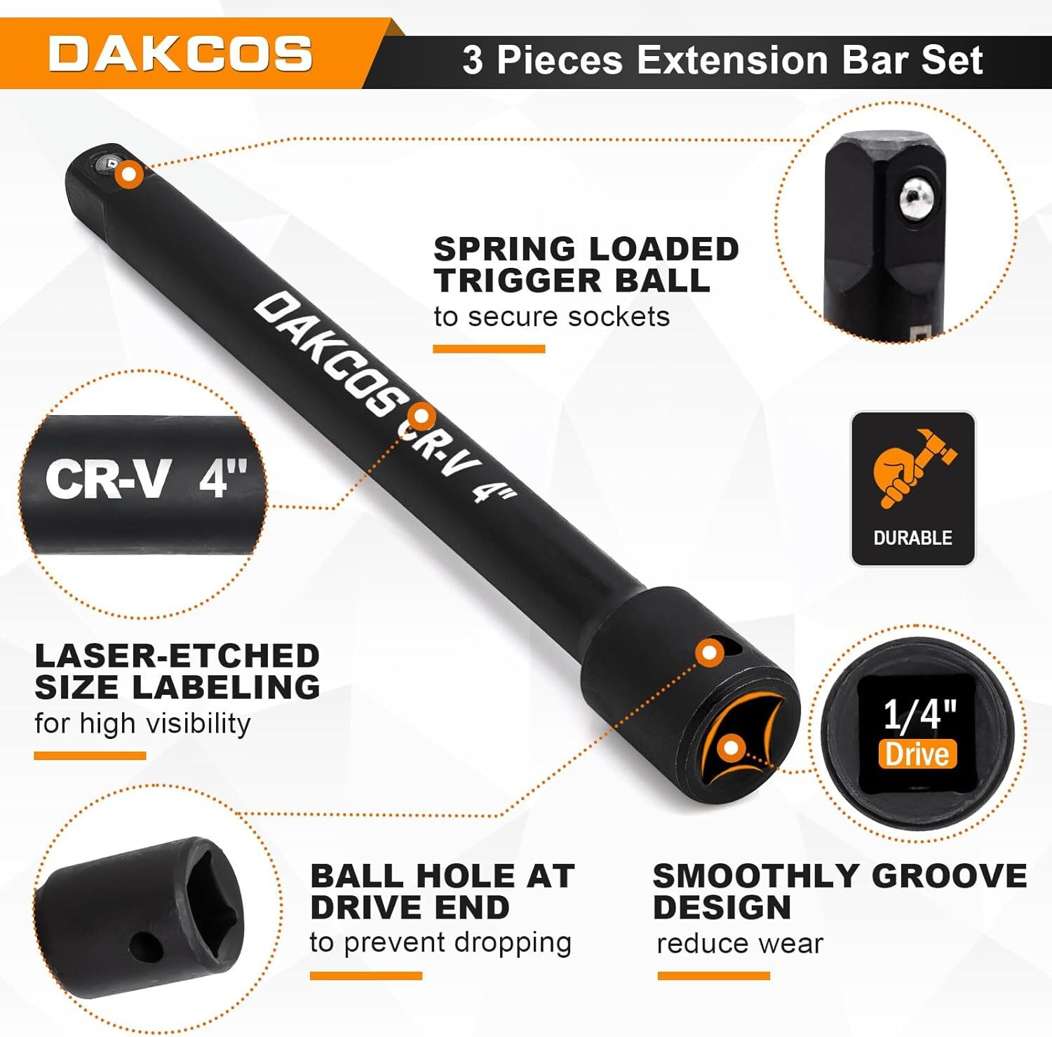 3 Pieces 1/4-Inch Drive Impact Extension Bar Set Includes 3 6 10 Inch Socket [[IMAGE]] Hello, We Do Sell Mobiles, Computers Tablets & Network Accessories! Features Set Size: 1/4" drive socket extension includes (2"/50mm, 4"/100mm, 6"/150mm) 3 pieces. Premium Materials: DAKCOS impact extension bar sets are made of premium chrome vanadium steel, can withstand greater torque. With black phosphate finish, corrosion-resistant and durable. Wide Application: Compatible with 1/4" drive electric, pneumatic and hand wrenches. With long bars easily reach lug nuts, bolts. Locking Design: The through hole in the base of the drive holds socket securely in place. Clearly Size: Laser-etched size words on the extensions are easy to read. Anti-rust oil on the surface of the product is normal. DAKCOS 3 Pieces 1/4-Inch Drive Impact Extension Bar Set Includes 2 4 6 Inch Socket Extensions, Premium Chrome Vanadium Steel with Black Phosphate Finish Batteries Required? No Finish Black Phosphate Finish Material Chrome Vanadium Steel Country of Origin China Compatible Fastener Range 1/4-inch drive bolts and nuts Drive System Square Item Weight 5 ounces Number of Pieces 3 Finish Type Black Phosphate Finish Package Dimensions 6.77 x 1.3 x 0.75 inches Size 1/4" Drive 1.3 inches x 6.77 inches x 0.75 inches. Weight: 5.0 oz Payment We accept all payments via Ebay using Credit Cards , PAYPAL , Apple Pay and many others Shipping We are always working hard to ensure your package arrives as soon as possible. Please understand that some factors like weather, high postal traffic, and the performance of shipping companies are outside of our control. Delivery & Return Policy We offer a 30-Day Return Policy on items in which you are not completely satisfied with. You have the option of a full-refund or an exchange of the item. No returns are available on items shipped outside of the USA.