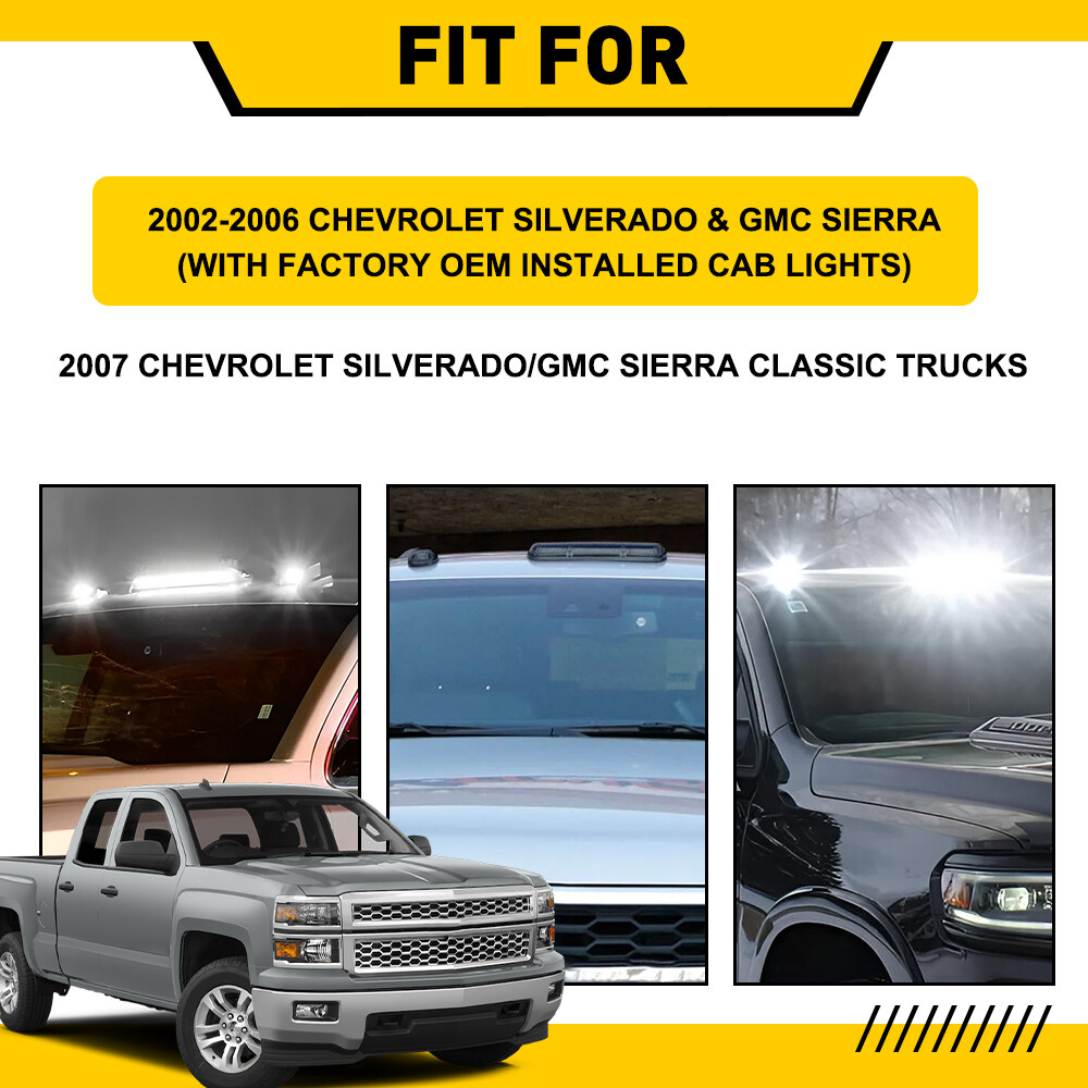 Perfect upgrade for my truck! These smoked LED cab lights look sleek and modern while providing ultra-bright white illumination—way better than stock. The build quality feels premium with proper waterproofing, and installation was straightforward with the clearly marked wiring. Lights up the road for safer nighttime driving while giving my Silverado a custom look. Love that it's plug-and-play for 2002-2007 models with factory cab lights – no modifications needed. Highly recommend!