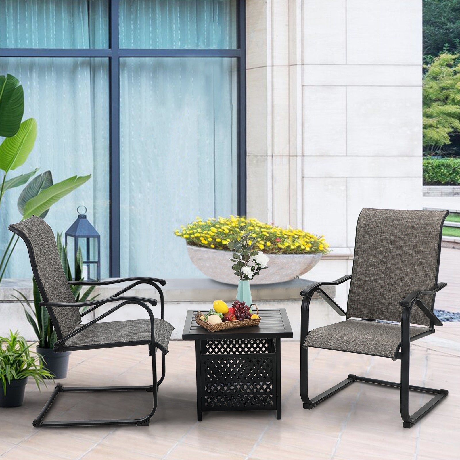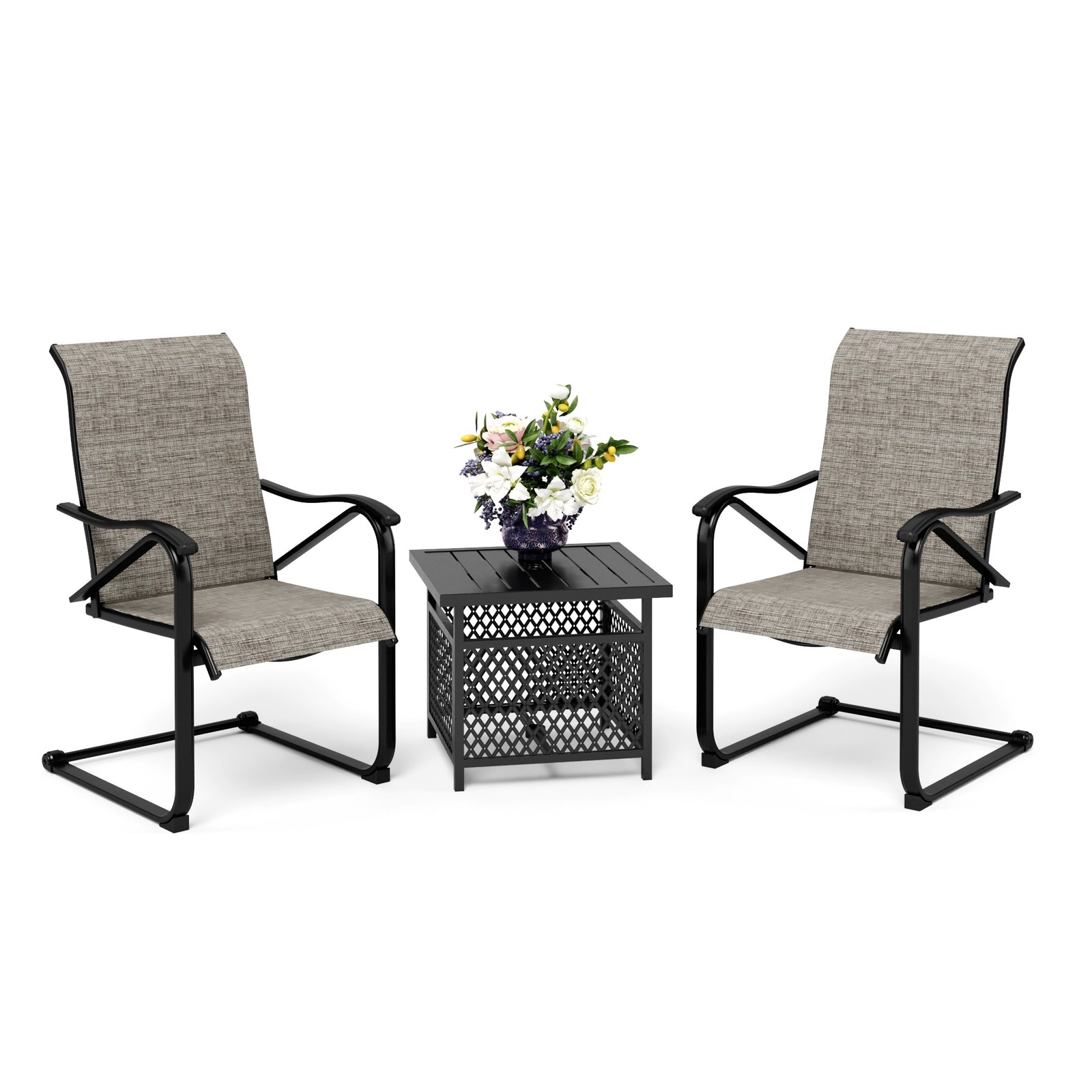 PHI VILLA 3-piece patio bistro sets perfectly create the mood for great conversation and cafe-style dining. The ideal choice for outdoors amusement, such as patio, garden, porch, deck or yard. This 3-piece outdoor bistro furniture set will make a lovely relaxing environment where you can catch up with friends or family over coffee or conversation. All materials are treated to resist weather, rust and fading throughout the year.Please NOTE: This set will be separated into 2 boxes for delivery. Because of the timeliness of logistics, their arrival time is different. Please wait patiently or contact the Overstock's service to check the logistics situation. Thanks for your understanding and cooperation.Note:The chair has been upgraded, and the rust on the legs of the chair has been Free Shipping Over $49.99* Details 3-Piece Patio Dining Set, Side Metal Table & 2 C Spring Motion Chairs, Product Description: PHI VILLA 3-piece patio bistro sets perfectly create the mood for great conversation and cafe-style dining. The ideal choice for outdoors amusement, such as patio, garden, porch, deck or yard. This 3-piece outdoor bistro furniture set will make a lovely relaxing environment where you can catch up with friends or family over coffee or conversation. All materials are treated to resist weather, rust and fading throughout the year. Please NOTE This set will be separated into 2 boxes for delivery. Because of the timeliness of logistics, their arrival time is different. Please wait patiently or contact the Overstock's service to check the logistics situation. Thanks for your understanding and cooperation. Note:The chair has been upgraded, and the rust on the legs of the chair has been improved. Features: Metal steel with E-coating, weather resistant and built for last. Side grid with high quality black powder coating, modern and stylish. Equipped with 1.57 umbrella hole, suitable for most umbrellas. Premium textilene spring motion chair, stylish and offers you rocking relax. Ergonomically designed outdoor furniture set, spacious enough for 2 people dining or conversation. Perfect for patio, porch, backyard, balcony, poolside, deck and other suitable space in your home. Simple assembly required 1-Year WarrantyIf there's any issue with the product, please contact us. Specifications: Table Dimension22" L x 22" W x 18.5" H Table MaterialSteel Chair Display Dimension23.4"L x 24.8"W x 41"H Chair MaterialSteel & Textilene Chair Max. Load300 Lbs Package Includes: Bistro Coffee Table x 1 Spring Motion Chair x 2 Accessory Bag x 1 Instruction Manual x 1