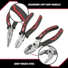 The New 3-Piece Pliers Set (Model 41114) includes the most common pliers essential for any tool box. These pliers are made from drop forged steel for strength and durability. Precision milled jaws and hardened cutting edges provide years of use at a great value. Heavy duty double molded grips minimize slippage and increase comfort. This set includes: 6-Inch Slip-Joint Pliers that feature a 2 position adjustable jaw for versatility, 6-Inch Diagonal Cutting Pliers which have honed and offset cutting jaws for flush cutting and 6-Inch Long-Nose Pliers which include a side cutter, are designed for secure gripping and accurate cutting in hard-to-reach spaces. New 3-Piece Pliers Set with Ergonomic Soft Grip Handles Ergonomic Soft-Grip Handles Heavy-Duty Steel Construction Includes: 1 - 6-Inch Slip-Joint Pliers, 1 - 6-Inch Diagonal Cutting Pliers, 1 - 6-Inch Long Nose Pliers