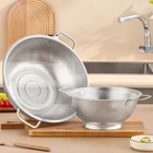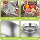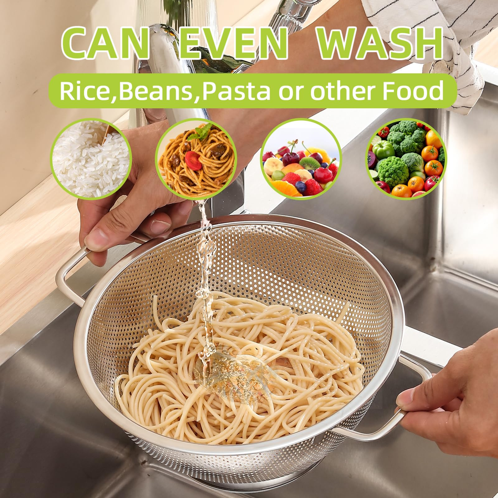 Fast Draining Colander: The strainer set can get rid from the frill water or oils of your rice or pasta in a few seconds or clean your potatoes, tomatoes, berries, and other vegetables and fruits effortlessly Microporous Strainer: The 2mm tiny and closely spaced holes on this pasta strainer are small enough for you to strain most beans, pastas, and grains as well as fruits and vegetables without any worries. The rice and spaghetti will drain fast and won’t fall through holes with this colander High Quality Material: Made of professional food-grade stainless steel material, the strainers for kitchen is rust and will never affect the taste of your food! The mesh on the rice washer is sturdy and will not warp, stretch, or snag even under heavy foods Great kitchen Colander: Holds 5 quart items. The stainless steel colander makes it easy to clean and prepare food, becoming an indispensable tool in your kitchen Dishwasher Safe: This rice washer strainer has a smooth surface, making it easy to clean. Just simply rinse it under running water, or put it in the dishwasher