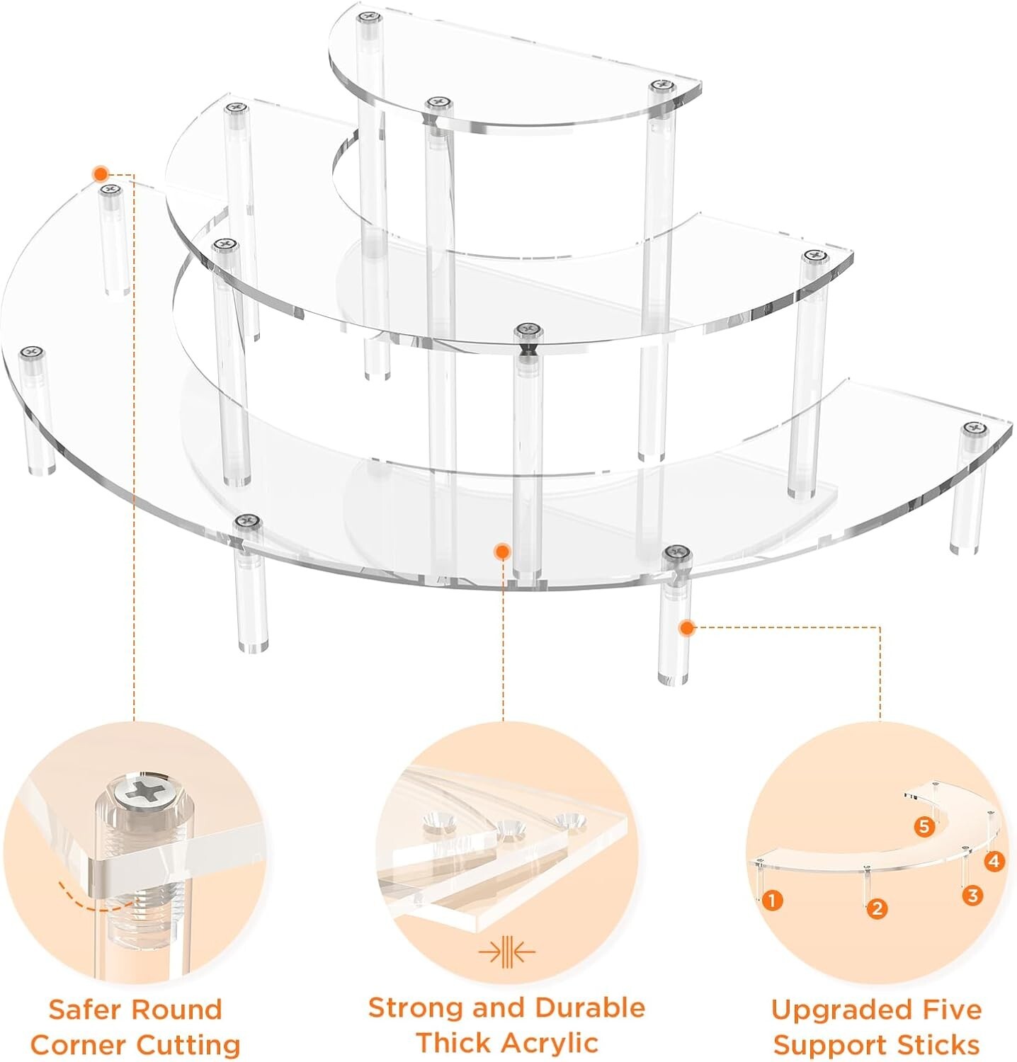 MULTI FUNCTION DISPLAY---Display shelves can not only showcase desserts and cupcakes at parties, but also display small items at home or shops. Perfect for parties, home decor, or retail shop displays. PREMIUM MATERIALS---This clear and durable cupcake stand is made of high-quality acrylic. The transparent design makes your items eye-catching and perfect for any environment. Please tear off the protective film before use it. EASY TO ASSEMBLE---The perfume organizer is easy to install and the packaging contains instructions and all necessary parts, it can be assembled in minutes. Perfume riser also easy to clean, disassemble and store. FREE ARRANGEMENT---Arrange the stands together in a full-circle or individually in semi-circles, provides orderly arrangement of items and saves space. Half-moon stand size: 15.3 X 7.6 X 5.8 IN.