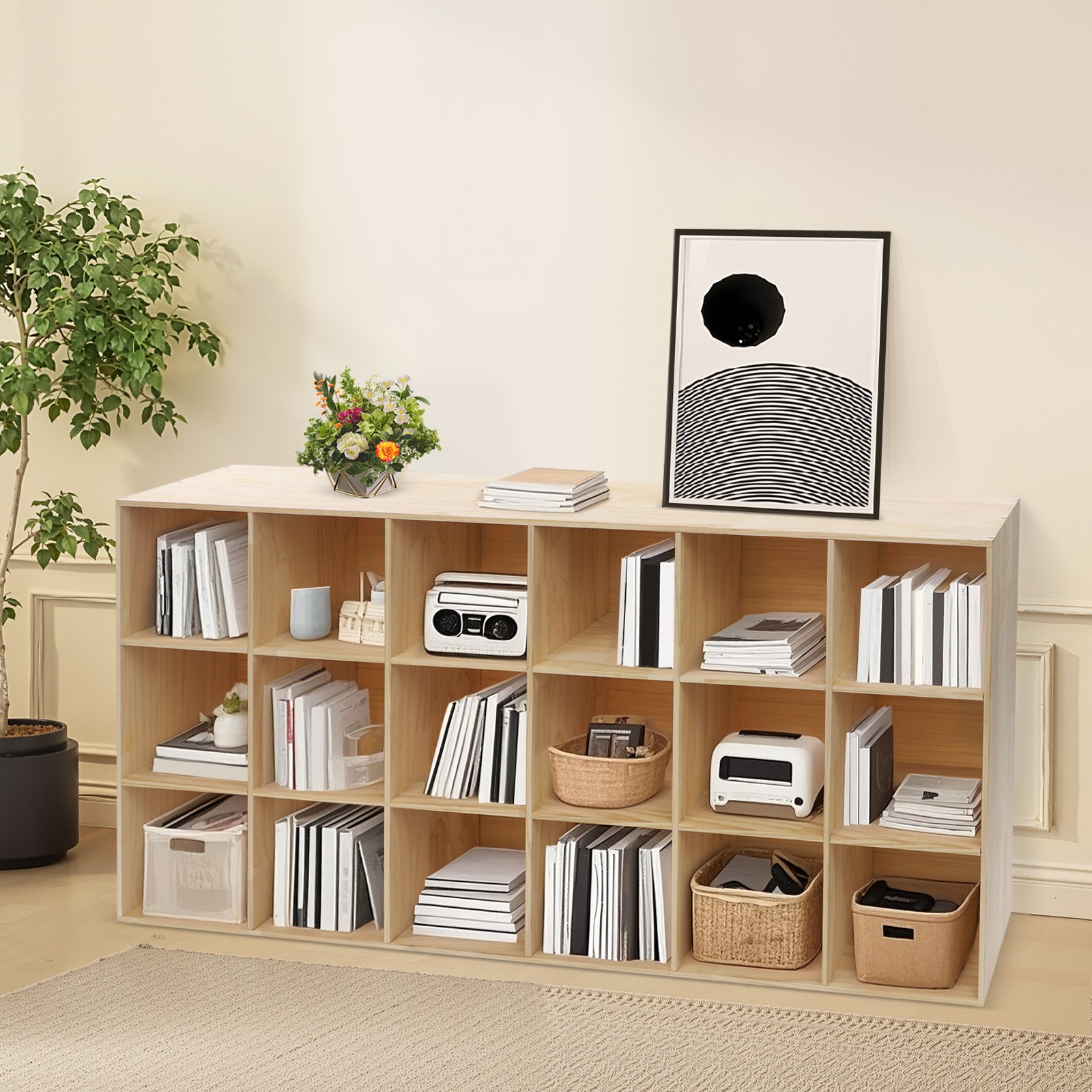 Specifications Color: Log Color Style: Modern Shape: Rectangular Material: Solid Wood, Plastic Assembly Required: Yes Mount Type: Floor Mount Load-bearing Capacity: About 100kg/220.46 lbs Number of Tiers: 3(Not Including the Top) Number of Compartments: 18 Gross Weight: 18.2kg/40.12 lbs Net Weight: 17.29kg/38.12 lbs Product Size: 180*30*90cm/70.87*11.81*35.43in Package Size: 191*37*11.5cm/75.2*14.57*4.53 in Package Included 1* 18-Compartment Bookcase 1* Sandpaper 4* Anti-collision Corners 1* English Installation Diagram All Accessories for Assembly 3-Tier Book Storage Shelf 18 Compartment Bookcase Large Magazine Display Cabinet Description Are you looking for a way to arrange books or other items in an orderly and aesthetically pleasing manner? Let's take a look at our 18- compartment bookcase . It's not only a great helper for storing books and crafts , but also a piece of art in your home. It ensures that your books are properly stored. Choose our product to enhance your reading experience. 【创意表达】 If you're searching for a stylish and organized way to display your books or other cherished items, look no further than our 18-compartment bookcase. More than just a functional bookshelf, it serves as a decorative centerpiece in your home while keeping your collection neatly arranged. Ideal for storing books, crafts, and more, this versatile piece blends practicality with elegance, enhancing your reading experience and enriching your space. Make the smart choice and bring order, style, and sophistication into your home with our thoughtfully designed storage solution. Key Features Built to Last: It is made of premium solid wood , which is environmentally friendly , impact-resistant, strong, and durable. 【创意表达】 Enduring Quality: Crafted from high-grade solid wood, this product offers eco-friendly construction combined with exceptional strength, impact resistance, and long-lasting durability. Storage Assistant: The 18- compartment design can store many books and other items. In addition, the top can also be used to place potted plants, dolls, flower pots, or other items(not included) to decorate your room and improve space utilization. 【创意表达】 Space-Saving Organizer: Featuring a 18-compartment layout, this versatile unit provides ample storage for books and various items, while its top surface doubles as a decorative space for potted plants, figurines, vases, or other personal touches (not included), enhancing both functionality and room aesthetics. High Stability: The product features thickened solid wood, tight mortise and tenon structure, and firm connections through sturdy screws that keep it stable under pressure, allowing it to withstand heavy weight( about 220.46 lbs ) without deformation, meeting your daily needs, and giving you peace of mind. 【创意表达】 Sturdy & Reliable: Constructed with reinforced solid wood and a tight mortise and tenon structure, and securely assembled using durable screws, this product offers exceptional stability even fully loaded, supporting heavy loads up to approximately 220.46 lbs without warping or deformation, ensuring dependable performance for everyday use and complete peace of mind. Thoughtful Design: The semi-open design promotes air circulation to ensure that the storage space is dry and well-ventilated while allowing for easy access to your items. The modern and elegant appearance also adds refinement and taste to your room. 【创意表达】 Smart & Stylish Design: The semi-open structure enhances air circulation to keep stored items dry and fresh, while also providing quick and convenient access. Combining functionality with aesthetics, its modern and sophisticated look effortlessly elevates the décor and ambiance of your space. Space Saving: It makes full use of vertical space and has a small footprint( 70.87*11.81 in), so you can place it against a wall or at a corner and save space while improving product stability. Simple Installation : The simple structure, a detailed English installation diagram, and complete installation parts allow you to assemble this product easily and quickly, which is convenient . Easy to Clean: Thanks to the smooth surface and simple structure, you can wipe the dirt from it with a dry cloth (not included). The full floor body is not easy to accumulate dirt and grime, making cleaning easier. Ideal Gift: This product is modern and practical and can be used as an ideal housewarming, birthday, and holiday gift for parents, friends, and loved ones. Buy with Confidence: We stand behind all our guests and look forward to assisting you with your purchase. It is our pleasure to answer your questions. The end of the story between us is not "we sell and you buy". Details Smooth Edge: The smooth surface and safe anti-collision corners not only enhance the aesthetics of the product but also improve its safety. 【创意表达】 Sleek & Safe Finish: The smooth surface and anti-collision corners not only add a refined visual appeal but also ensure enhanced safety for users. Deepened Compartments : They can accommodate taller or wider items, provide more storage space, and effectively prevent items from falling out. Sandpaper: It is used to sand the surface of wood, remove burrs and unevenness, making it smoother and more refined, thereby enhancing its overall appearance and feel. 【创意表达】 Practical Sandpaper : Designed to smooth wood surfaces by removing burrs and imperfections, this sandpaper delivers a refined finish that enhances both the texture and visual appeal of the material for a professional-quality result. Application It can be widely used in the home, living room, office, study, dormitory, coffee shop, milk tea shop, and other places for storing books, magazines, collectibles, stationery, photos, ornaments, small potted plants, and other items. Specifications Color: Log Color Style: Modern Shape: Rectangular Material: Solid Wood, Plastic Assembly Required: Yes Mount T