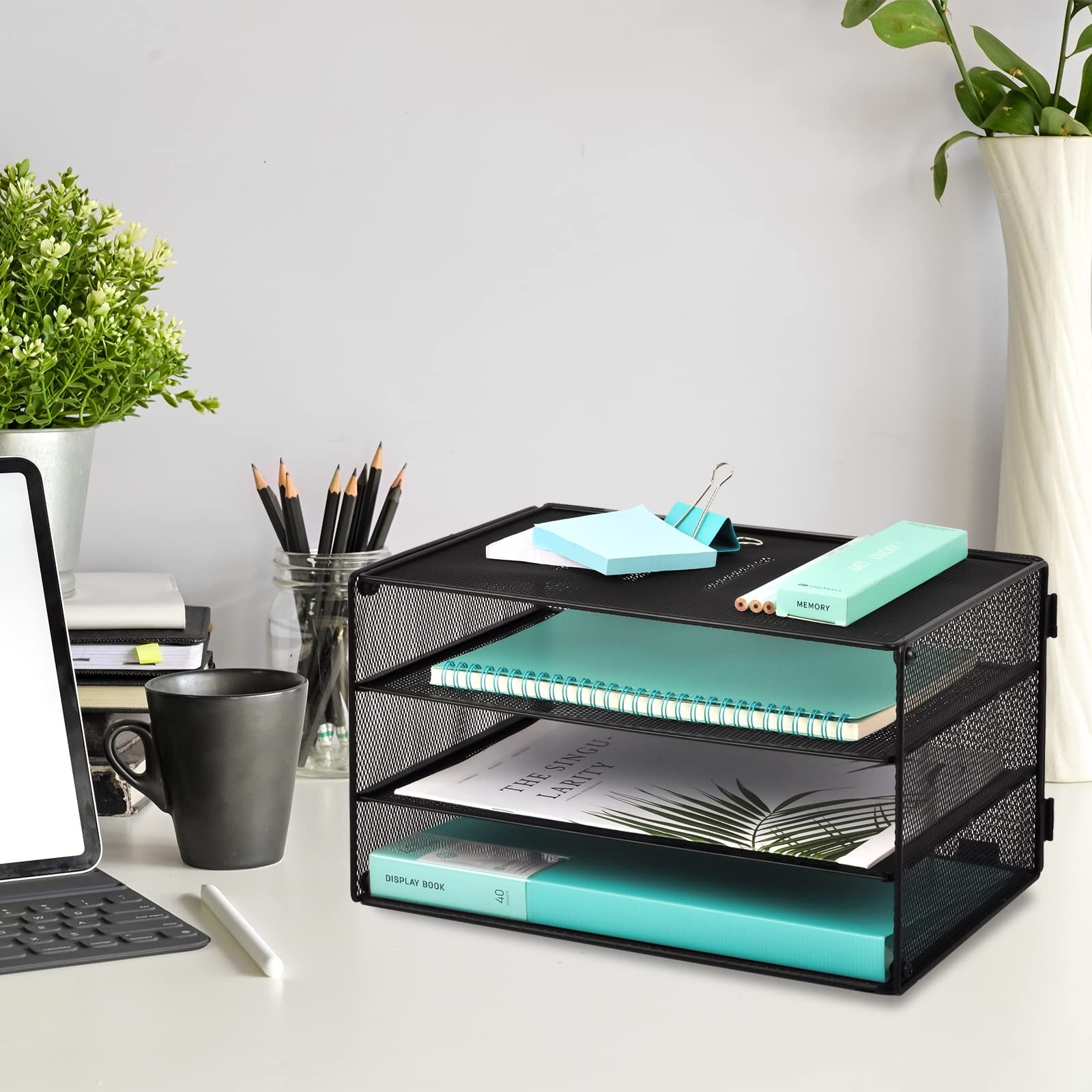 Desktop Organizer - 3 Tier storage tray great for organizing A4 size paper, letter size folders, files, magazines, notebooks, top of the shelf to storage stationery Stability Construction - Easy to assemble, made of sturdy black wire mesh construction, strong enough for holding office desk accessories Declutter Your Desk - Keep files organized well and within reach, open design lets you identify the contents quickly, be more efficient with clutter free desktop Contempopary Design - Contemporary and elegant mesh construction with powder coat finish will blend in with any decor,great for home or office Approximate Dimensions (in inches) - 12.9L X 9W X 7.6H. Customer satisfaction is our top priority! If you have any problem, don't hesitate to us.