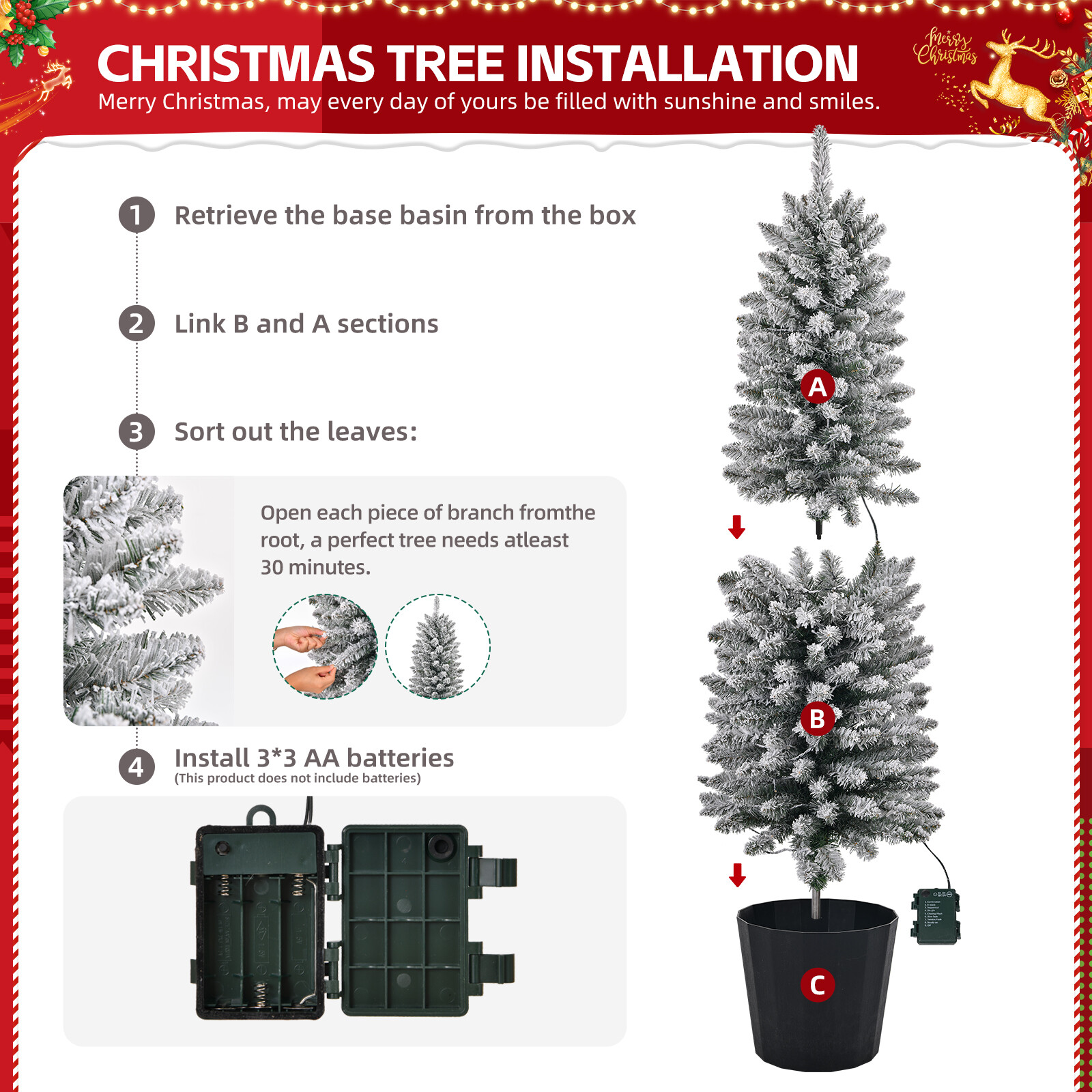 listing template VISIT OUR STORE SIGH UP FOR EMAIL 3ft/4ft/5ft Set of 3 Snow Artificial Christmas Trees for Holiday Party Xmas Introductions: Create a magical holiday atmosphere in your home with our stunning prelit Christmas treess. Designed to capture the beauty of the season, these trees bring warmth and joy to any space. With realistic branches and integrated lights, they offers a perfect canvas for your festive decorations. Whether you prefer a minimalist look or a lavish display, these trees set the stage for your holiday celebrations, making them a timeless addition to your home for many seasons to come. Easy to set up and built to last, these trees will be the ideal centerpiece for your holiday décor. Features: 1. Set of 3 Flocked Trees: Use them in different places or put them in one place. With meticulously crafted branch tips dusted in a delicate snow flocking, these trees create an enchanting winter wonderland right in your home. 2. Customizable Lighting: Elevate your holiday ambiance with pre-installed LED lights. Featuring warm white light and 8 dynamic lighting modes, you can easily customize the ambiance to suit your mood or occasion with a simple press of the button on the battery box. 3. Versatile Holiday Centerpiece: Whether placed in your living room, entryway, or office, this tree is designed to impress. Its natural, lifelike appearance instantly transforms any space into a festive retreat, captivating your guests and infusing your home with the joyous spirit of Christmas. 4. Built to Last: Crafted from premium, flame-retardant PVC, this tree is built to last for many holiday seasons. The sturdy, thick branches are capable of holding your Christmas ornaments, while the plastic pot stand ensures that your tree remains stable and secure throughout the season. 5. Perfect for Personalization: This mini prelit tree offers endless possibilities for decoration. Whether you prefer a minimalist look or a lavish display, the life-like branches are the perfect backdrop for lights, garlands, and ornaments, allowing you to create a unique and festive atmosphere in any space. Specifications: 1. Overall Height: 3ft, 4ft, 5ft 2. Tree Width: 17.7in / 45cm, 19.7in / 50cm, 21.7in / 55cm (Measured from Tree's Widest Point) 3. Branch Tips: 130, 180, 250 4. Color: Snowy Green 5. Branch Material: PVC 6. Pot Stand Material: Plastic 7. Pot Stand Diameter: 3.7in / 9.5cm, 4.7in / 12cm, 5.9in / 15cm 8. Number of LED Lights: 50, 100, 150 9. LED Light Color: Warm White 10. LED Light Modes: 10 Modes 11. Power Cord Length: 11.8in / 30cm Package Includes: 3 x Christmas Trees 3 x Pot Stands You might like this more>> Set of 10 Plastic Folding Chairs Wedding Party Event Chair $135.99 Makeup Case Cosmetics Organizer 2 Small & 5 Large $23.65 12-Batten 4 Tier Storage Organizer Shoes Tower $24.59 2PC Patio Rattan Wicker Chair Sofa Patio Garden Furniture $99.99 High Gloss TV Unit Cabinet Stand with LED Lights $132.99 Commercial Heavy Duty Clothing Garment Rolling Collapsible $53.99 Shipping Policy 1. Ship worldwide from New Jersey by reliable shipping companies -- USPS, UPS, FEDEX, DHL, etc., and only to VERIFIED PAYPAL ADDRESS. Transport Delivery ETA. Package handling only takes 1 business day at our warehouse, so please make sure entering correct payment and shipping information before checking out. Once your payment is completed, we are not going to accept any more changes to your order. 2. International Buyers – Please Note: a. Import duties, taxes and charges are not included in the item price or shipping charges. These charges are the buyer's responsibility. b. Please check with your country's customs office to determine what these additional costs will be prior to bidding/buying. 3. Please check your shipping address carefully before checkout, it can't be changed if order completed. 4. Orders placed on weekend will be shipped within 2 days.Notification of shipment with tracking number will be sent to buyers. 5. Standard shipping: 2-7 business days Expedited Shipping: 2-3 business days One-day Shipping: 1 business day International shipping: Varies 6.Ship within 1 business day once payment completed. Notification of shipment with tracking No. will be sent to buyer. 7.We offer discounts for combine shipping. Please contact us first if you need combine shipping, and an invoice with discount will be sent to you. 8.Please allow 5 business days for delivery to US destinations on any eBay orders and 14 business days for delivery to any International destinations. We highly recommend our buyer choose priority/expess mail for international delivery which is much more stable. Return Policies 1. Refunds given only if item DOA and cannot be replaced via PAYPAL . If so, Please contact us with 5 days since you receive the item and and return to us within 30 days from the delivery date for exchange or refund. 2. If you need return, please contact our customer service representative, let us know the detailed problem and send us some pictures for confirmation. Payment Payment should be sent within 8(EIGHT) days of auction closing. Feedback If you are dissatisfied for any reason, please do not be quick to leave negative/neutral feedback. We work hard to make sure EVERY CUSTOMER 100% SATISFIED and resolve any problem for you. Work Time Work Time: Monday to Saturday About Us | Newsletter| Feedback| Contact Us Copyright © 2021 ECMonster. All rights reserved. 无标题文档 3ft/4ft/5ft Set of 3 Snow Artificial Christmas Trees for Holiday Party Xmas Introductions: Create a magical holiday atmosphere in your home with our stunning prelit Christmas treess. Designed to capture the beauty of the season, these trees bring warmth and joy to any space. With realistic branches and integrated lights, they offers a perfect canvas for your festive decorations. Whether you prefer a minimalist look or a lavish display, these trees set the stage for your holiday celebrations, making them a timeless addition to your home for many s
