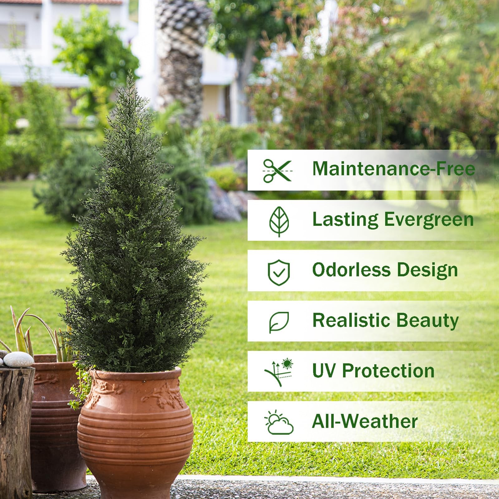 Transform your outdoor space with these stunning 3-foot or 4-foot artificial cedar topiary trees. This set of 2 potted cypress trees brings the timeless elegance of manicured landscaping without the maintenance. Each tree features meticulously detailed, UV-resistant foliage that maintains its rich green color throughout the seasons. The classic conical shape and dense branch arrangement create a sophisticated silhouette perfect for framing entrances, enhancing porches, or adding structure to garden designs. Arriving in sturdy black planters, these versatile decorative trees can be used straight away or transferred to decorative containers of your choice. Their realistic appearance and durable construction make them ideal for both indoor and outdoor use, offering year-round greenery without watering or pruning. At 3 feet or 4 feet tall, these topiaries provide the perfect scale for entryways, patios, or as accent pieces in your landscape design. ALL-WEATHER UV PROTECTION OUTDOOR TOPIARY TREES: Engineered with premium UV-resistant foliage that withstands intense sun exposure & heavy rainfall while maintaining true evergreen coloration. Perfect for permanent outdoor display on patios, porches, or garden landscapes without fading concerns ULTRA-REALISTIC ARTIFICIAL CEDAR TREES: Realistic textured cedar foliage and natural green coloring creates a convincing evergreen look; Two height options (3 ft and 4 ft) for versatile indoor/outdoor display coordination MULTI-FUNCTIONAL DECOR FOR EVERY SPACE: Creates effective visual barrier when placed in pairs; Use as windbreak partitions for pool areas, driveway border markers, or commercial property accents. Ideal for enhancing porches, front doors, gardens, patios, or indoor spaces with maintenance-free greenery, whether it is for home, office, commercial space, or holiday decorations, this cedar tree can easily create a different atmosphere and style ZERO MAINTENANCE ARTIFICIAL CEDAR TOPIARY TREES: Bring the beauty of nature into your space without the hassle of maintaining traditional plants. Special updated coating on the leaves helps maintain color and prevents fading when placed in outdoor settings. The premium construction makes them resistant to fading and weather damage. Perfect alternative for high-traffic commercial spaces or busy homeowners MULTI-LOCATION READY USE: Pre-potted in weighted planters for immediate placement stability, these topiary trees require no assembly and can be placed immediately for instant decoration. Weighted bases prevent tipping in windy conditions; Compatible with various outdoor surfaces (concrete deck gravel); Neutral planter complements modern and traditional decor schemes