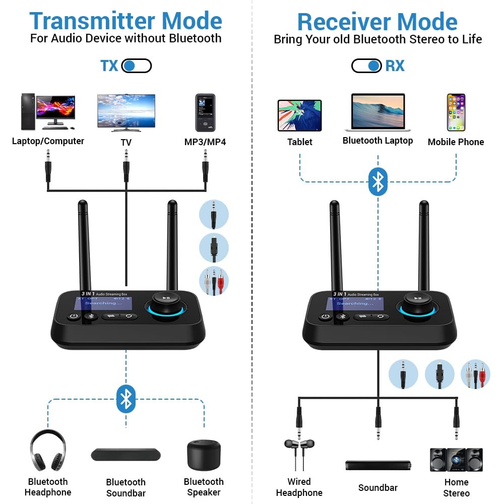 warm:This bluetooth transmitter receiver with 2 antenna has no battery inside, connect the power supply before use. Frequently Asked Questions: Q1. Cannot connect to optical cable and RCA at the same time. A: In three modes (TX/RX/BYPASS), optical is default. In the case of optical fiber insertion, if AUX is connected at the same time, AUX will take precedence, the machine will automatically recognize AUX and display it. But RCA cannot be used with optical fiber at the same time, you need to unplug the unused cable, otherwise both will not work. Q2: Cannot connect to my device. A: Please confirm: 1. You have selected the correct mode. 2. your Bluetooth device was in pairing status and that the both devices are within 1m during pairing. Q3: The Bluetooth audio transmitter is connected to my TV via fiber optic but there is no sound. A: Please check you have set PCM on the TV. In general, you will find the audio mode in the TV settings and click "Settings - Sound - Digital Audio Output - Select "PCM"". Q4: The connection is unstable and easy to disconnect. A: Please initialize the Bluetooth transmitter, and then reconnect again to see whether there is still the same problem. Transmitter initialization: Long press the Bluetooth identification button to disconnect, then turn off and restart. Q5: There is a delay. A: The delay is also related to the connected devices, and surrounding Bluetooth devices can also affect signal transmission. It is recommended to turn off other surrounding Bluetooth devices and try to connect to other devices to confirm if the same problem persists. Product Description: Featuring bluetooth technology, you can enjoy wireless audio from non bluetooth tv/pc by connecting your bluetooth headphones or earbuds , streaming audio by connecting your bluetooth phone or tablet to your wired speakers or car stereo system. Say goodbye to tangled cords. Dual antenna, LCD screen, multi-functional knob, low latency, aux/rca/optical port, you will have a great wireless experience with this bluetooth transmitter receiver. Features: Bluetooth Transmitter Mode: Via bluetooth connect, connecting bluetooth device headphones or earbuds and enjoy audio from your non-bluetooth tv/pc. Bluetooth Receiver Mode: Via bluetooth connect, connecting bluetooth smartphone, tablet, laptop and play audio on your non-bluetooth sound system/speakers/soundbars. Bypass Mode: Wire connect, connect tv and speakers/soundbars/stereo by wires,enjoy great audio from your own music system. Connect Two Devices: You can easily link two wireless earphones or speakers simultaneously in tx mode. Intuitive Lcd Screen: With lcd screen you can konw the status of clearly. Every step will shows on the display. 2 Antenna: With 2 antenna, longer and stronger transmit can be achieved. Enjoy stronger and clearer signal in the house. Bluetooth Transmit: Connect your headphones or earbuds so you can listen to music wirelessly. Multiple Connection : With aux, rca, opt 3 port can match kinds of old tvs, home stereos. No need to buy a new one. Product Specification: size: 3.3×1.3×0.4 inch net weight: 0.15lb battery capacity: 5v 500ma bluetooth version: 5.0 what's in the box? 2 Antenna Bluetooth Transmitter & Receiver*1 3.5mm Aux Cable*1 Male Rca Cable*1 Opt Cable*1 Charging Cable*1 Multifunctional Bluetooth 5.3 Audio Adapter: Wirelessly transmit audio from non-bluetooth tv, pcs, entertainment systems to your wireless earbuds, earbuds, or headphones. Receive audio from a smartphone or other bluetooth source device and then transmits audio to non-bluetooth wired speakers, car/home stereos, headphones. This bluetooth transmitter for tv can meet your kinds of needs. Dual Connection: This tv bluetooth transmitter can connect up to two wireless earbuds or headphones at once,making sharing a easy pease. 2 Antenna For Further And Better Transmit: This bluetooth audio transmitter designed with 2 antenna can achieve longer and strongre transmit. You can walk around the house freely without worrying about losing the signal. Visible Using With LCD Screen: Featured 1.8inch lcd display making pairing was an absolute breeze. This wireless audio transmitter and receiver will make sure you can connect the right device and be clear about the device status. Multiple Connection Choice: This rca to bluetooth transmitter can ompatible with 99% tv and home stereo systems with 3 ports design-aux/rca/optical, brings you the most flexible and quality connection. Note1: This transmitter does not support amplifiers such as Yamaha amplifiers or audio converters. Note2: When you connect TV with optic cable, you need to set PCM on TV.
