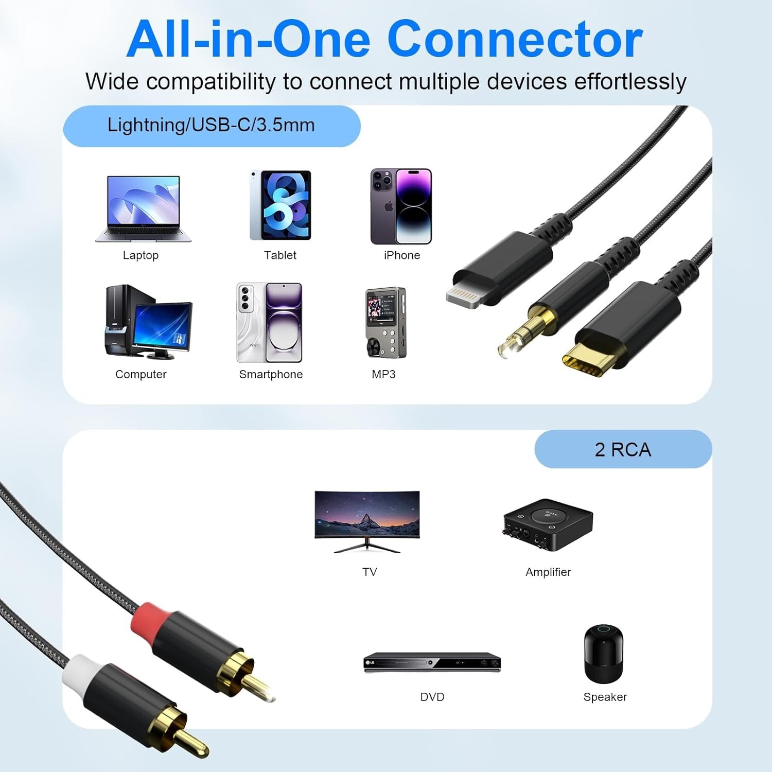 About this item 3-in-1 Multi-Function Design: This RCA cable combines three input options—USB-C, Lightning, and 3.5mm AUX—making it easy to connect your device to RCA-compatible equipment. Whether you have an iPhone, Android phone, or a traditional 3.5mm audio device, this RCA to aux cable has you covered Wide Compatibility: Compatible with a variety of devices such as smartphones, tablets, laptops, and more, this 3 in 1 to RCA cables supports USB-C, Lightning, and 3.5mm AUX outputs. Easily connect to any RCA input to enjoy audio playback on stereos, TVs, or other analog audio equipment Excellent Audio Quality: With gold-plated connectors, this 3.5mm to RCA cable ensures superior signal transfer, minimizing interference and signal loss. Whether you’re connecting to speakers, amplifiers, or a home theater system, it delivers clear, high-quality sound Plug and Play: No additional software or drivers required—just plug in your devices and enjoy an instant audio connection. Whether you’re a professional or a casual user, this USB C to RCA cable offers a simple and hassle-free way to connect to RCA-equipped sound systems Durable and Premium Build: Crafted with a strong, braided exterior, this lightning to RCA audio cable able is designed to last. The flexible nylon jacket resists tangling, and the reinforced connectors provide a secure fit, making it ideal for frequent use at home or on the go