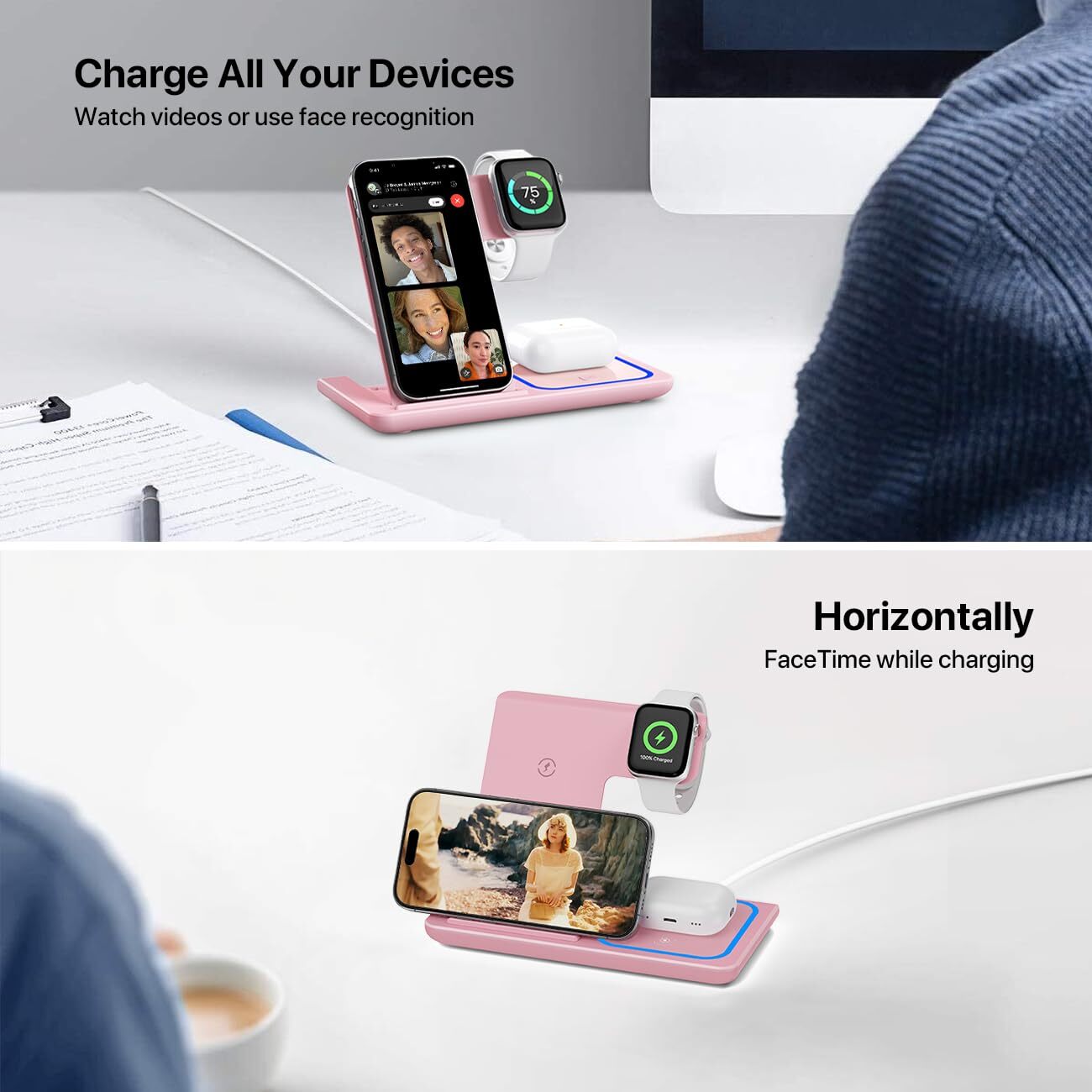 Wireless Charger for iPhone, Wireless Charging Station for Multiple Devices Apple, 3 in 1 Wireless Charger Stand Compatible with Apple Watch, iPhone & AirPods, Wireless Charging Pad with Adapter(Pink) [3 in 1 Charging Station] The wireless charger conveniently charges for your iPhone, Apple Watch,AirPods,and other devices with wireless charging capability simultaneously. The charging station make powering up your entire desktop and nightstand a breeze,say goodbye tangled cords.Compatible with iPhone 14,13,12,11 Pro/Max/Mini/Plus,X,XR,XS/Max,SE,8/Plus, iWatch 8/7/6/5/4/3/2/SE, AirPods 2/3/pro/pro 2. [Fast Wireless Charger] Just place your wireless devices on charging station and a steady, efficient charge begins on contact.After many extreme tests and fan feedback, we use high-power charging chips and world-class electronic to ensure the fast charging quality of charging station.The wireless charger takes about 2-3 hours to give your phone, watch, and earphone a full charge with an equipped 18W adapter. [Safe Wireless Charger Stand] Wireless charging station for apple with over-current protection, over-voltage protection, over-temperature protection, and foreign object detection function. Reasonable internal circuit of the wireless charging station for apple design prevent overcharge damage to the equipment battery and ensure safe and fast charging of the device. [Foldable Travel Wireless Charger for iphone] The wireless charging station for multiple devices apple offers fast charging for your iphone at home, in the office and on the go due to its compact and folding design. The wireless charger for apple acts as a wireless charger stand holder with angle adjustment. The wireless charger for iphone acts as wireless charger pad, just leave phone flat to keep it charging. [Case Friendly & Sleep-Friendly Indicator] The wireless charger for iphone supports most phone cases not thicker than 2 inches/5 mm, so saving the trouble to remove the phone case while charging with wireless charging station (not including cases with magnetic or metal attachments). Place the devices on wireless phone charger to start charging, and the Blue light will be on and turn off automatically after 20s. So you will not worry about the light affecting your sleep. [What you get] You will get a 1* 3 in 1 Fast Wireless Charging Station Dock, 1*USB-C Cable, QC 3.0 fast power adapter and a user guide. Every charging station we sent to you has gone through a series of quality inspection processes. If you have any questions, please contact us and we'll provide you with a satisfied solution. Shipping We offer FREE shipping on all orders! We ship within Three business days of payment, usually sooner. We use a selection of shipping services such as UPS, FedEx, USPS etc. We only ship to the lower 48 states, no APO/FPO addresses or PO Boxes allowed. Local pickups and combined shipping options are not provided at this time. Return You can return a product for up to 30 days from the date you purchased it. Any product you return must be in the same condition you received it and in the original packaging. Please keep the receipt. Payment We accept payment by any of the following methods: PayPal Please pay as soon as possible after winning an auction, as that will allow us to post your item to you sooner! Feedback Customer satisfaction is very important to us. If you have any problem with your order, please contact us and we will do our best to make you satisfied. Contact Us If you have any queries, please contact us via ebay. We usually respond within 24 hours on weekdays. Please visit our eBay store to check out other items for sale! Thank you for shopping at our store.