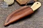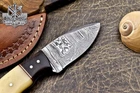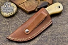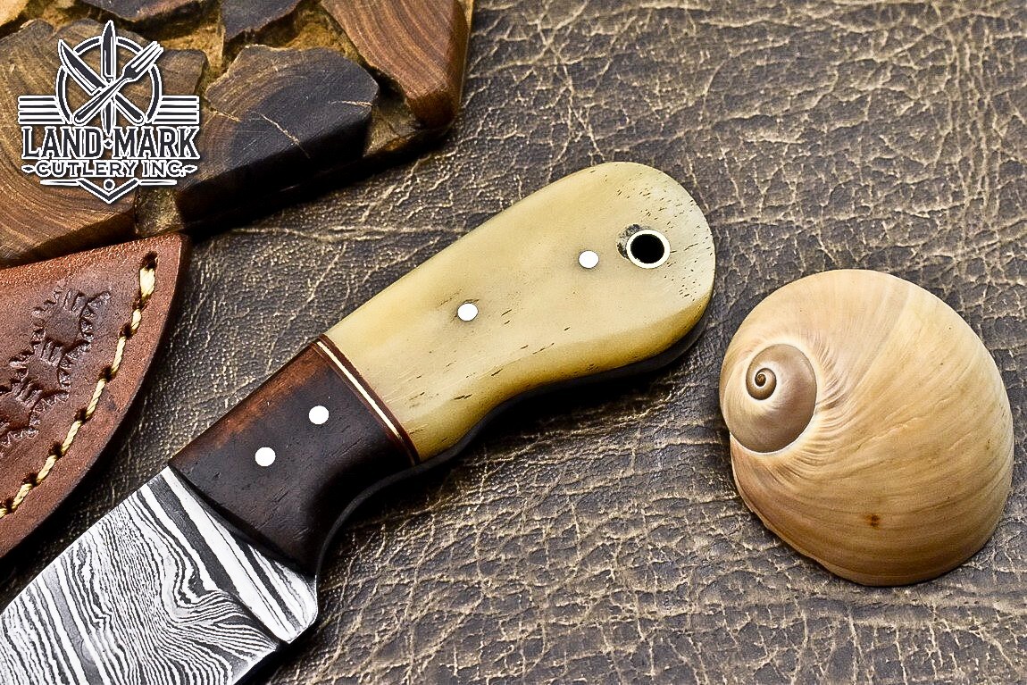 Custom Hand Made DAMASCUS STEEL HUNTING KNIFE WITH CAMEL BONE HANDLE We offer a shipping discount for More then one purchased . And discount will be apply on combine invoice, Discount will not apply on separate payment. ITEM DETAILS OVER ALL LENGTH 3.0 inches long (Approx) HANDLE LENGTH 1.5 inches long (Approx) BLADE LENGTH 1.5 inches long (Approx) BLADE HARDNESS 58-60 HRC Which Holds The Sharp Edge For Long Time. HANDLE CAMEL BONE COVER LEATHER SHEATH This Awesome custom made KNIFE has a nice hand forged with the combination of 4340 & 1080 steel. HOW OUR DAMASCUS IS MADE: All our Damascus is real and not just an acid etch. Damascus is a mixture of 1080HC and 4340 nickel carbon. You heat them up together and then fold the bar over and over to get the desired layers, ours are 396 layers. Then you burn the blade in acid, and it turns the nickel satin color and the high carbon turns blackish gray. This is how the layers are exposed to show the layers of the new steel created coined "Damascus". All Damascus is acid etched to show the layers. If you high polish the metal it will be shinny satin like all steels. Only after you burn the sides of the blade with acid do you see the layers of the two steels. Makes sense? After we make our knives we high polish the handles and put an edge on the blade. The high polishing buffs off the acid burned layer of the handle, and the blade edge is sharpened and the acid burned edge becomes satin. You can re-burn the tang of the blade near the handles and the edge of the blade and it will show the layers once more. All our knives are hand made, durable and unique ***** YOU WILL RECEIVED THE SAME KNIFE Qality Standards Our Damascus blades are made from high quality non-stainless steels which rival or exceed any Damascus blade made from the 10 series with 4340. Our Damascus combination has taken years to perfect and has been tested under a variety of application which will offer professional performance in categories of toughness, strength (lateral stress) and edge honing and holding ability. In a 5 spot Rockwell test our blades will average near or close to 58 which offers a perfect balances between its toughness and strength.Our blades due to carbon content need to be regularly treated with wax and/or 3 in 1 oil to maintain its superior quality. Questions if you have any question feel free to send us message we aim to answer all questions within 24 hours Feedback If you are not satisfied with our service please contact us before leaving any negative or natural feedback. We will resolve all issues as quickly as possible. Disclaimer We are not responsible for any injuries associated with the use of our tools. Our products are intended for legal use only by responsible buyers. Therefore, we will not sell our products to anyone under the age of 18. Before bidding please check your country laws as some countries Custom don't allow this. If your purchase is held by Custom Authorities in your country/State we will not be responsible for that and no refund will be issued Shipping We offer a 20% shipping discount for More then one purchased . And discount will be apply on combine invoice, Discount will not apply on separate payment We ship within 24 hours after receiving complete payment but this can be delayed due to week ends or Governments and Religious Festivals . . This is beyond our control and we apologize for this inconvenience. Precautions Our Tools are very sharp so open and use them very carefully We are not responsible for any injuries associated with the use of our tools Tips to Care knife 1. NEVER STORE YOUR KNIFE FOR LONG TIME IN LEATHER SHEATH. 2. LEATHER CAN ABSORB WATER, WHICH WILL RUST THE KNIFE. 3. ALWAYS CLEAN THE BLADE AFTER USING WITH OIL OR WAX