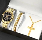 Simplify your style with this sleek Men's Business Three Eyes Digital Watch, a versatile addition to any wardrobe. The set includes a bracelet and necklace, both designed to complement the classic round watch face with its bold black dial and digital display. The combination of black and gold tones in the bezel and band offers a sophisticated contrast that pairs well with both formal and casual attire. Crafted for the modern man, the watch features a durable stainless steel band, perfect for daily wear or travel. Whether you're dressing up for a sport event or a business meeting, this unbranded timepiece keeps you looking sharp and on time, embracing a range of styles from classic to contemporary.