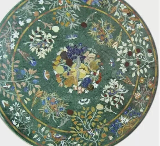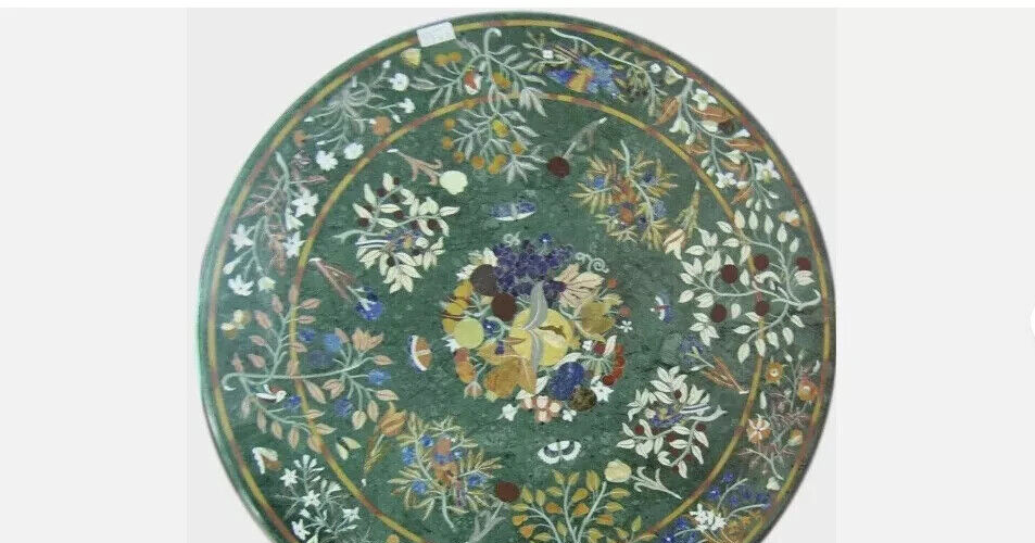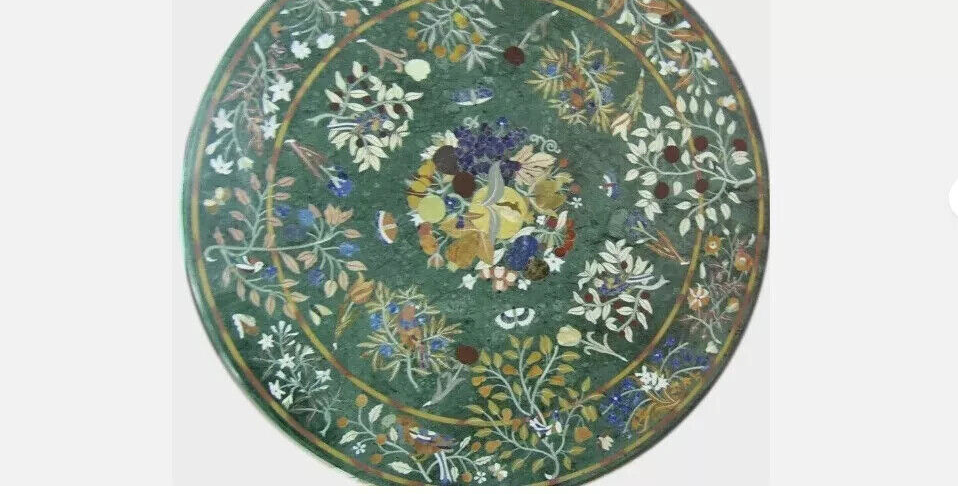 Welcome To Stone-Craft-Creations Shop Description Very unique Art by Indian Artist ,Coffee/Side Table top Used Material: Marble & Multi Semi Precious Gemstones Inlaid Size: 48"x48" inch Color: Green Shape: Round Pattern: Handmade Room: Bedroom, Dining Room, Hallway, Home Office/Study, Kid’s Bedroom, Kitchen, Laundry/Utility Room, Living Room,Patio, Playroom Packaging: Wood & Foam Export Packing Shipping: Air Can be customize ,Please message your desired size Process of Making Marble Inlay 1. We are inlaying semiprecious stones in three different colors of marble White Marble,Black Marble & green marble. 2. The Marble used to inlay the semiprecious stone comes from city of Makrana, Rajasthan India. 3. First we cut the marble in different shape example Round,Octagonal,rectangle,oval & square shape. 4. After cutting the marble we paint the surface of marble with Hina(red Color) so we can sketch the geometry on the surface of Marble. 5. With the Help Of emery wheel we cut,polish & shape the semiprecious in different forms of flowers,buds,leafs & stems all the cutting of the semiprecious stones are manually cut by the artisans. 6. After cutting the semiprecious stones we assemble them to complete the motif & then the semiprecious stones are placed on the surface of marble so we can trace them on the surface of marble to make the exact size of the cavities once the stones are traced we remove the stones from the surface of marble & then manually we chisels the marble with the diamond chisels & tungsten carbide chisels once the cavities are completed we place the semiprecious stone in the cavities to check the depth of the stones. 7. When we are fully sure that the stone fits well in the cavities we use special kind glue to fix the semiprecious stones into the marble. 8. After completing the inlays into the marble we first rub the surface of marble with sandstone & then we polish the surface of marble with sandpaper which brings the natural shine on the surface of marble & to the semiprecious stone & we use wax polish to make the surface shiny. 9. Most interesting expect of this pietre dure( marble inlay with hard stone) all the designs are made by the artisans are purely an imagination of artist once made they cannot make another one exactly the same it will look similar but will not be the same. 10. This beautiful art is a dying art of Agra,India the artisans those make this beautiful art are the descendants of those families who built the Tajmahal in 17 century Tajmahal is a monument of love & you can easily see the artwork done with the same technique on the walls of the Tajmahal. 11. I Invite you to come to Agra,India & visit the beautiful Tajmahal & you will surely be impressed & we request you give us a chance to show you the true handmade art of Agra by our artisans. 12. When you are purchasing this beautiful handmade Marble inlay art you will always be happy because all the pcs made by our artisans with love,hope & happiness. 13. You will always be enjoying the beautiful handmade marble inlay artwork secondly you will be supporting the local artisans of Agra,India to keep this beautiful dying art Alive. 14. All the purchase benefits the artisans & the buyer as there is no middle men in selling & buying. Inspiration/Story Behind This Product 1. This beautiful inlay art is a dying art of Agra,India the artisans those make this beautiful art are the descendants of those families who built the Tajmahal in 17 century Tajmahal is a monument of love & and one of the seven wonders in the world you can easily see the artwork done with the same technique on the walls of the Tajmahal. Note 1.The marble inlay table is made in Agra, India. 2.The marble inlay table will be delivered by FedEx or DHL free of cost door to door. 3.If there is any local tax,custom duties or Vat will be paid by the buyer at the destination. 4.The parcel is dispatch with proper packing & fully insured covering all kind of risk. 5.This marble table illuminates if the light arrangement is made under the plate. 6.It is an art piece which will be a beauty & the conversation pieces at home. 7.If You Are Looking Something Customize, Let Us Know We Will Make For You As Per Your Design, Size & Shape. 8. This is only Table Top & Base/Leg is not included. If you want stand/leg also, please contact us For Wholesale or corporate Inquiry please contact us. Thank you very much for admiring beautiful handmade marble inlay art. Please recommend your friends & family members to visit our ebay store this art is Dying art of Agra & we need your participation to keep this dying art alive. Thanking you in anticipation for your great support. If you are in Agra please email us we love to show you the process of marble inlay work at our premises