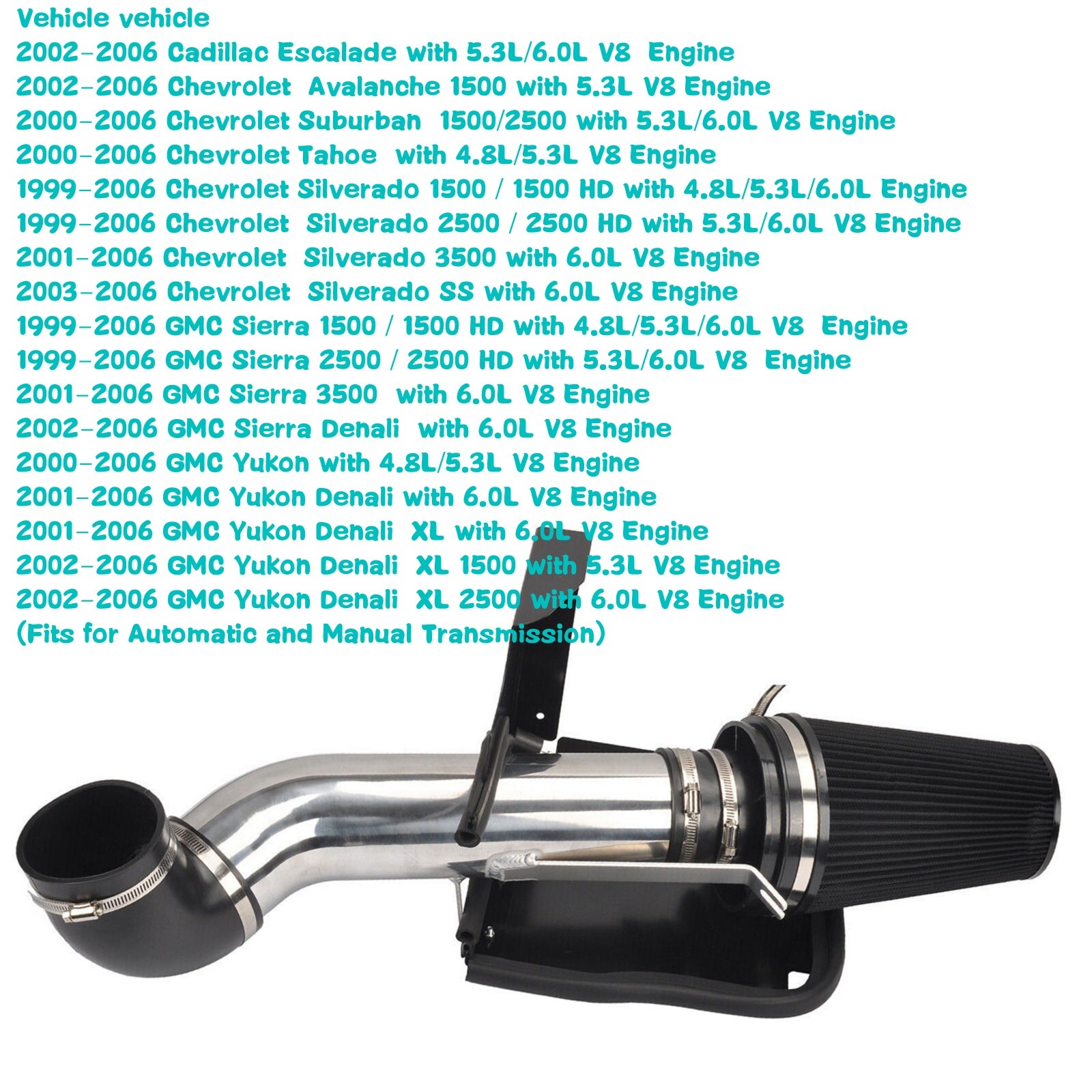 Store Categories Store Categories Ford 3 Row Radiator 4 Row Radiator Chevy 3 Row Radiator 4 Row Radiator Dodge Ram 3 Row Radiator 4 Row Radiator jeep 3 Row Radiator 4 Row Radiator Air Intake Pipe Intercooler Parts Intercooler Pipe Kits Intercooler Other 4" Cold Air Intake&Heat Shield Kit For 1999-2006 GMC&Chevy 1500 2500 4.8L 5.3L 6.0L V8 Product Description This High Performance Aluminum 4" Cold Air Intake System & Heat Shield is designed for a For 1999-2006 Chevy and GMC 4.8L 5.3L 6.0L V8 Engines Vehicle vehicle 2002-2006 Cadillac Escalade wit h 5.3L/6.0L V8 Engine 2002-2006 Chevrolet Avalanche 1500 with 5.3L V8 Engine 2000-2006 Chevrolet Suburban 1500/2500 with 5.3L/6.0L V8 Engine 2000-2006 Chevrolet Tahoe with 4.8L/ 5.3L V8 Engine 1999-2006 Chevrolet Silverado 1500 / 1500 HD with 4.8L/5.3L/6.0L Engine 1999-2006 Chevrolet Silverado 2500 / 2500 HD with 5.3L/6.0L V8 Engine 2001-2006 Chevrolet Silverado 3500 with 6.0L V8 Engine 2003-2006 Chevrolet Silverado SS with 6.0L V8 Engine 1999-2006 GMC Sierra 1500 / 1500 HD with 4.8L/5.3L/6.0L V8 Engine 1999-2006 GMC Sierra 2500 / 2500 HD with 5.3L/6.0L V8 Engine 2001-2006 GMC Sierra 3500 with 6.0L V8 Engine 2002-2006 GMC Sierra Denali with 6.0L V8 Engine 2000-2006 GMC Yukon with 4.8L/5.3L V8 Engine 2001-2006 GMC Yukon Denali with 6.0L V8 Engine 2001-2006 GMC Yukon Denali XL with 6.0L V8 Engine 2002-2006 GMC Yukon Denali XL 1500 with 5.3L V8 Engine 2002-2006 GMC Yukon Denali XL 2500 with 6.0L V8 Engine (Fits for Automatic and Manual Transmission) Description: 100% Brand new, never been used Color: Black, Silver It's the ultimate performance Cold Air Intake Kit with Heat Shield The air intake kit can help your engine to draw in more cold air resulting in better throttle response and higher explosive horsepower output The kit includes a steel heat shield that features a durable carbon-black powder coating for long lasting good looks The heat shield protects the filter from dirt and debris and to keep hot underhood air away from the element for a cooler intake air charge It can increase 8-10% of Horsepower and 6-8% of torque Easy to install and easy to fit with simple tools Professional installation highly recommended. Item Specifications: Condition:100% Brand New Fitment Type: Performance/Custom Surface Finish: Polished Placement on Vehicle: Front Intake Pipe Material: T-6061 Aircraft Grade Aluminum Type: Cool Air Intake System Material: T-6061 Aluminum Size: 4 Inch Color: Black , Silver Package Includes: 1x Powder coated steel heat shield, 1x Black Air Filter (Washable and Reusable), 1x 4" High Quality Silicone Coupler (NOT CHEAP RUBBER), 1x 4" High Quality Silicone Coupler 90° (NOT CHEAP RUBBER). Instruction included Item Features: 1 Each intake kit comes with a huge, highly-efficient air filter which results in better performance and better protection for your engine. 2, Most new design are now dry filter instead of oil filter. Our filter do not require oil, it is reusable and washable. You can wash it with soap and water, rinse it until it is all dry up and use it again. We recommend you to check every 5,000 miles to see if it needs to be wash / clean. 3, Silicone is a premium rubber which seals better and lasts longer. The air filter, couplers and tube seals in our intake kits are made from our premium silicone rubber. This means they won't crack, has exceptional tear strength, and can handle temperatures as high as 400F. Also, with a high friction surface and no oily residue, our silicone filters and couplers won’t slide off the tube. 4,Simple to install Direct replacement, easy install and no special tool requirement. 5, ACCS air intake systems kit are designed to greatly reduce intake restriction as they allow for smoother and straighten air flow. This kit replaces your vehicle's restrictive factory air filter and intake housing. Up to 100,000 miles without filter cleaning. 6, Our cold air intake kit effectively increases horsepower by 5-10%, torque by 6-8%, and produces attractive intake noise. Advanced oil-filled synthetic filter design helps protect your engine from damaging contaminants. How to install: Step 1 - Make sure your engine is cool to the touch. Step 2 - Disconnect your battery cable from the negative terminal. Step 3 - Remove your old air intake. Step 4 - Attach the silicone coupling that came with the air intake kit to the throttle body. Step 5 - Secure the coupling by tightening a hose clamp at the end. Step 6 - Place another hose clamp on the front of the coupling, but don’t tighten it just yet. Step 7 - Slide the intake tube into the silicone coupling, and ensure that your intake pipe is running from the throttle bay away from the engine bay. Step 8 - Tighten the silicone coupling and secure all brackets on the tube. Step 9 - Plug the mass air flow sensor into the new cold air intake system. Step 10 - Reconnect the battery.Enjoy the new power boosts immediately! Payment Policy Shipping Policy Returns Policy Feedback Terms of sales Payment Policy We only accept ebay payment. All payments should be received within 7 working days after auction has ended. Non-paying bidders will be reported to ebay. If you can not pay in time, plz contact us. Shipping Policy Item will be shipped out within 48 hours upon receipt of your payment through Air mail. Please make sure your address in eBay is correct. If you want to c hange the address, please give us an ebay message right away once you make the payment. Combing shipment is not allowed. If you want to combine all the items together, you should still pay for all of the shipping, insurance and handing fees. Considering the cost of business and easy shipping, usually the item is packed in retail packaging. Returns Policy Our return policy fully complies with E-bay's return policy. Item can be returned or exchanged . Refund is available if you are not entirely happy with your purchase. Items must be returned unused and packed properly so that they will not be damaged while in transi
